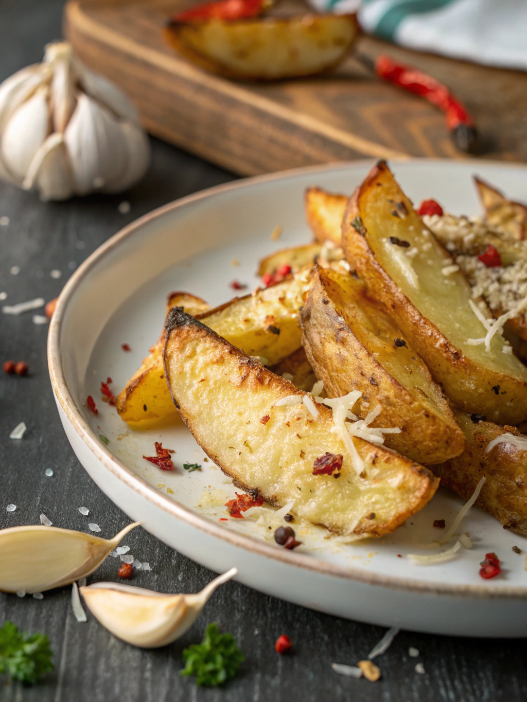 Crispy potato wedges baked with garlic and parmesan for a flavorful side dish.