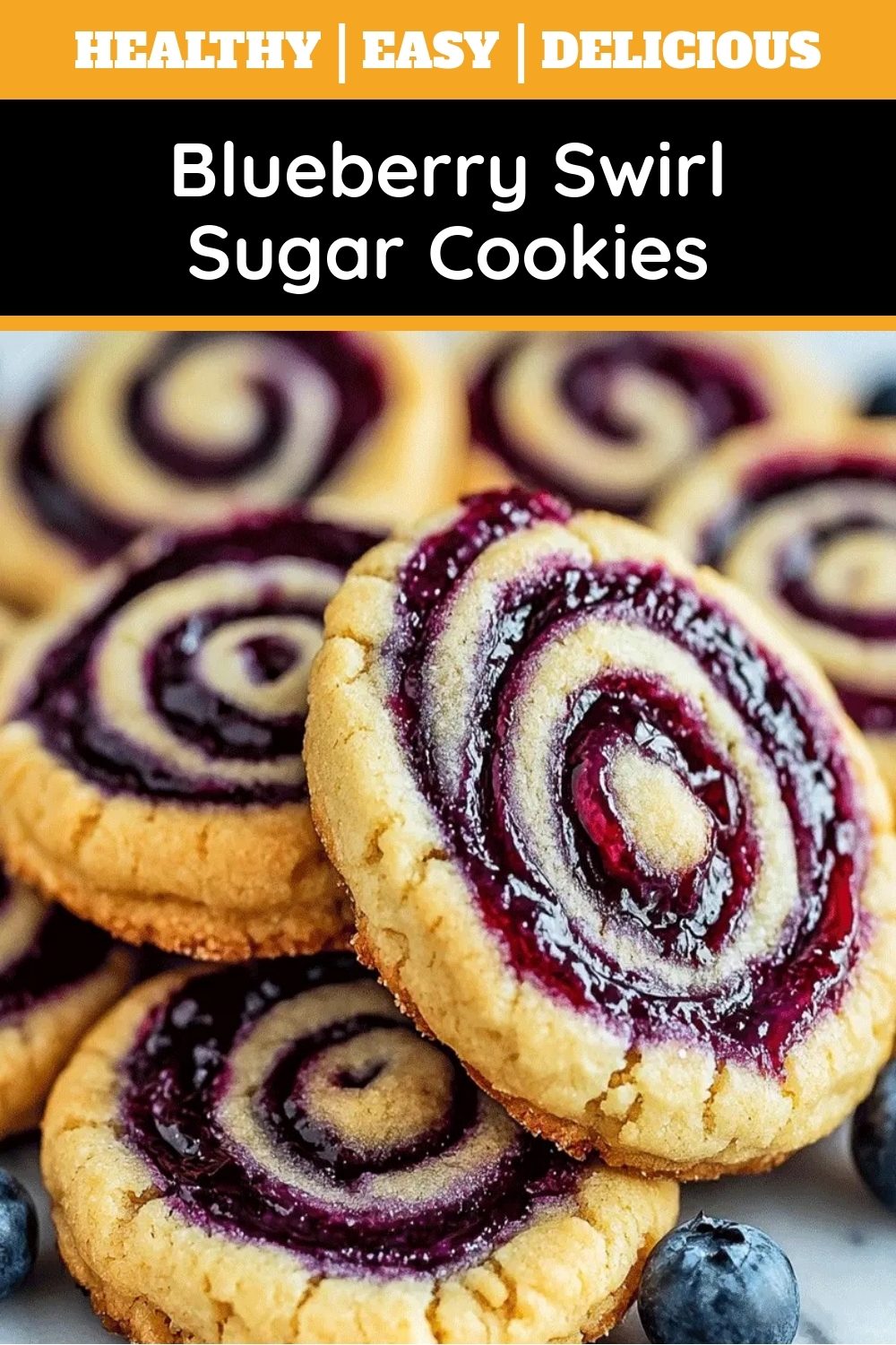 Soft and chewy sugar cookies with a vibrant blueberry swirl, perfect for any occasion.