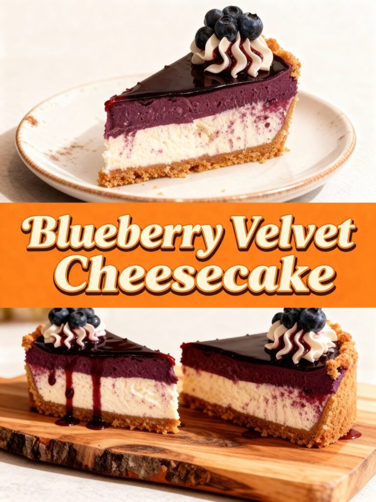 This Blueberry Velvet Cheesecake combines a buttery graham cracker crust with a velvety smooth cream cheese filling swirled with sweet blueberry jam and fresh berries, creating a dessert that’s both visually stunning and incredibly decadent.