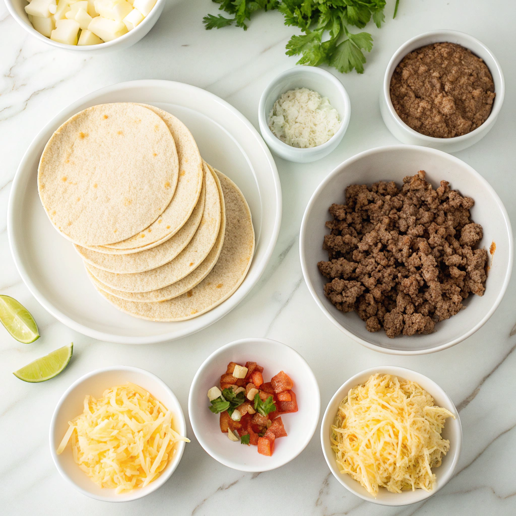 Flavorful seasoned ground beef with melted cheese, served in warm corn tortillas and topped with fresh cilantro and onions for an authentic street taco experience.