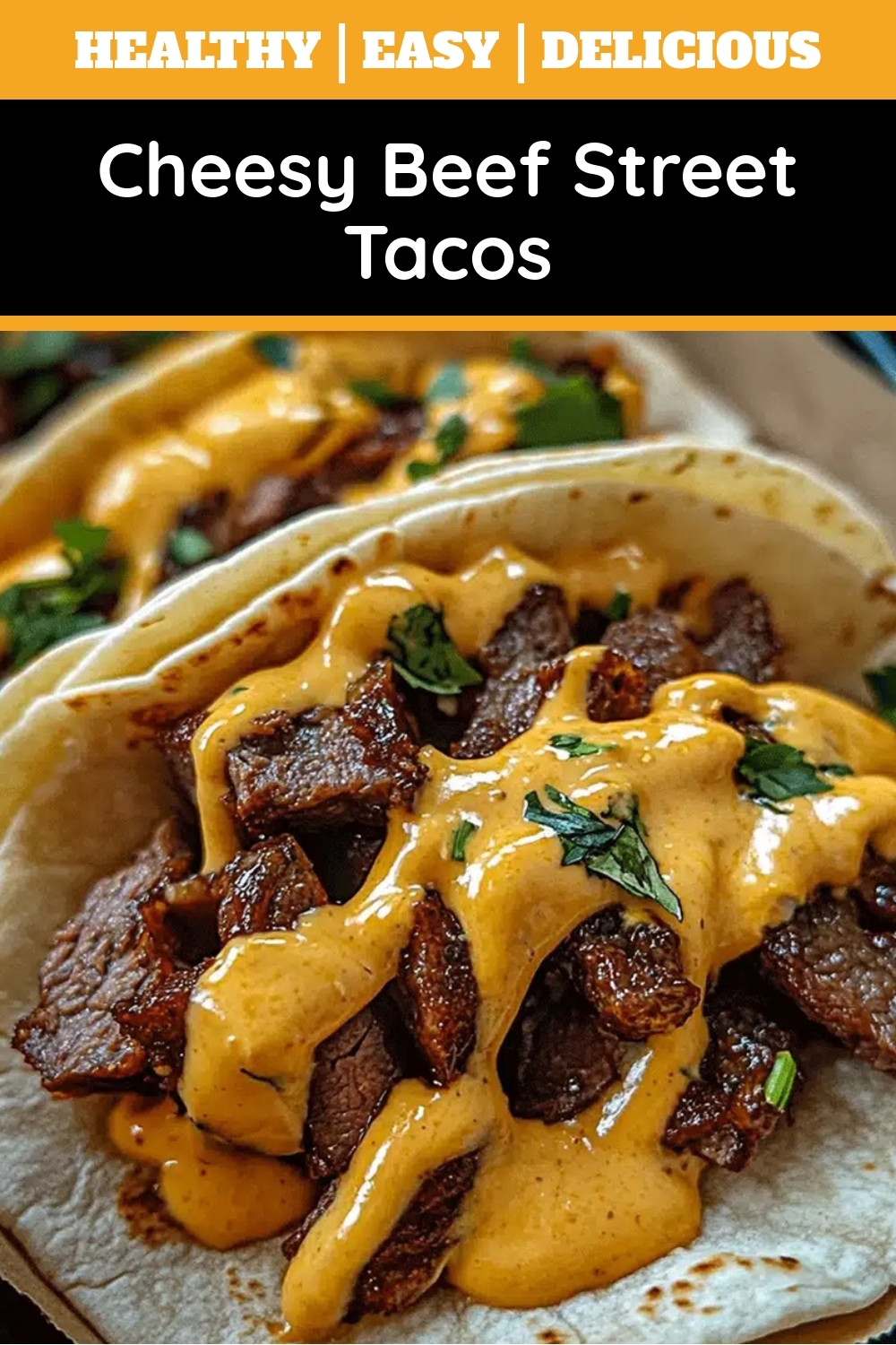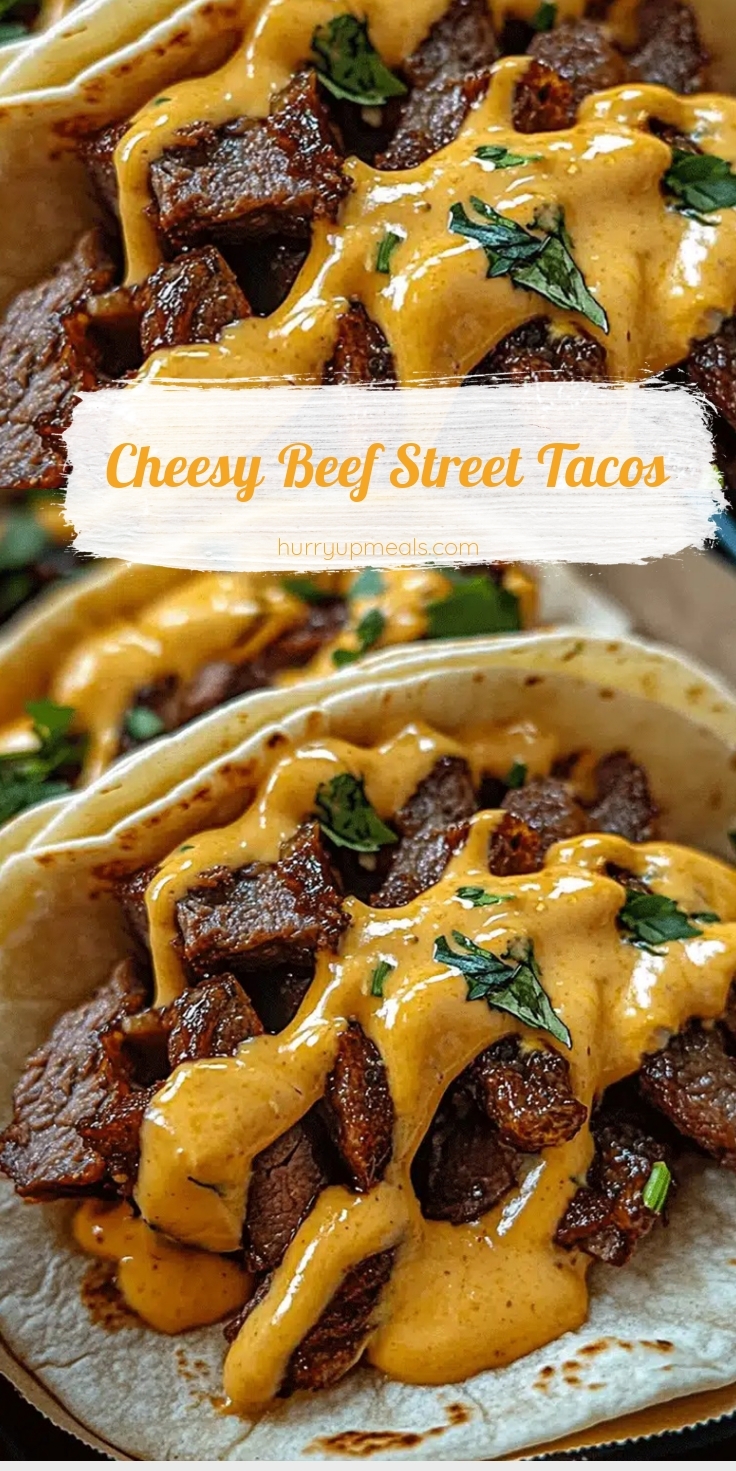 Authentic street tacos are typically made with small, soft corn tortillas, grilled meat (like carne asada), chopped onions, fresh cilantro, and a squeeze of lime. Cheesy Beef Street Tacos build on this foundation by adding a generous amount of melted cheese for extra richness.