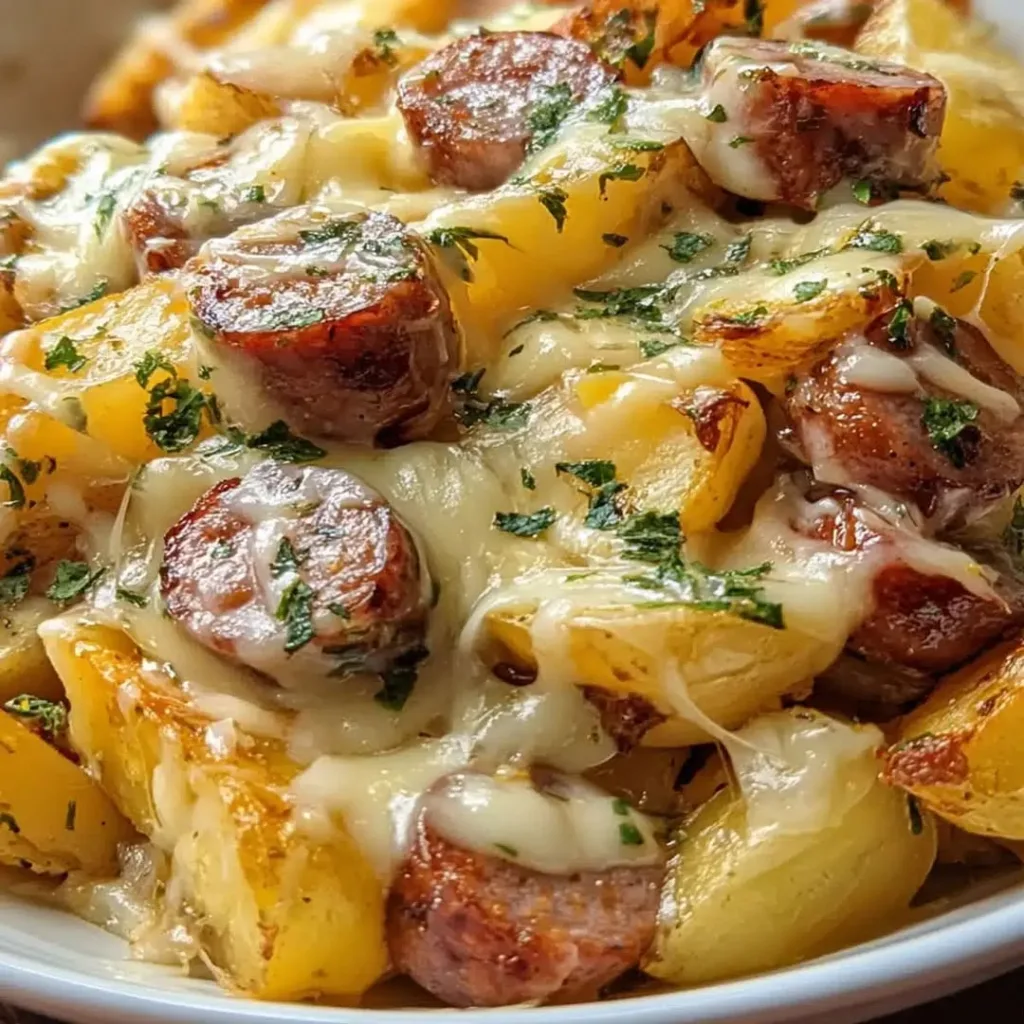 A hearty and flavorful one-pan dish featuring tender potatoes, smoked sausage, and melted cheese with a ranch seasoning twist.