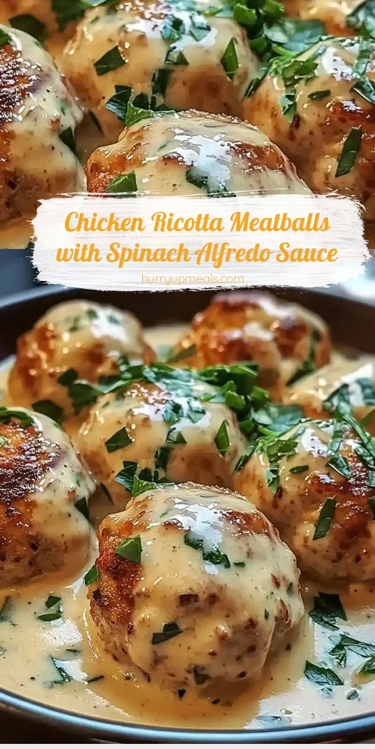 If you want to elevate Chicken Ricotta Meatballs with Spinach Alfredo Sauce even further, try swapping regular Parmesan for aged Pecorino Romano, which adds a sharper, saltier kick. A sprinkle of red pepper flakes or a dash of smoked paprika can introduce a subtle heat that contrasts beautifully with the creamy sauce. For extra freshness, top the dish with a handful of chopped basil or parsley just before serving. If you love bold flavors, drizzle a bit of garlic herb sauce over the meatballs for an herby punch. Another way to enhance the meal is by pairing it with a side of roasted vegetables, which add a caramelized sweetness that complements the creamy Alfredo. Whether you stick to the classic recipe or experiment with these tweaks, Chicken Ricotta Meatballs with Spinach Alfredo Sauce will always shine as a crowd-pleasing favorite.