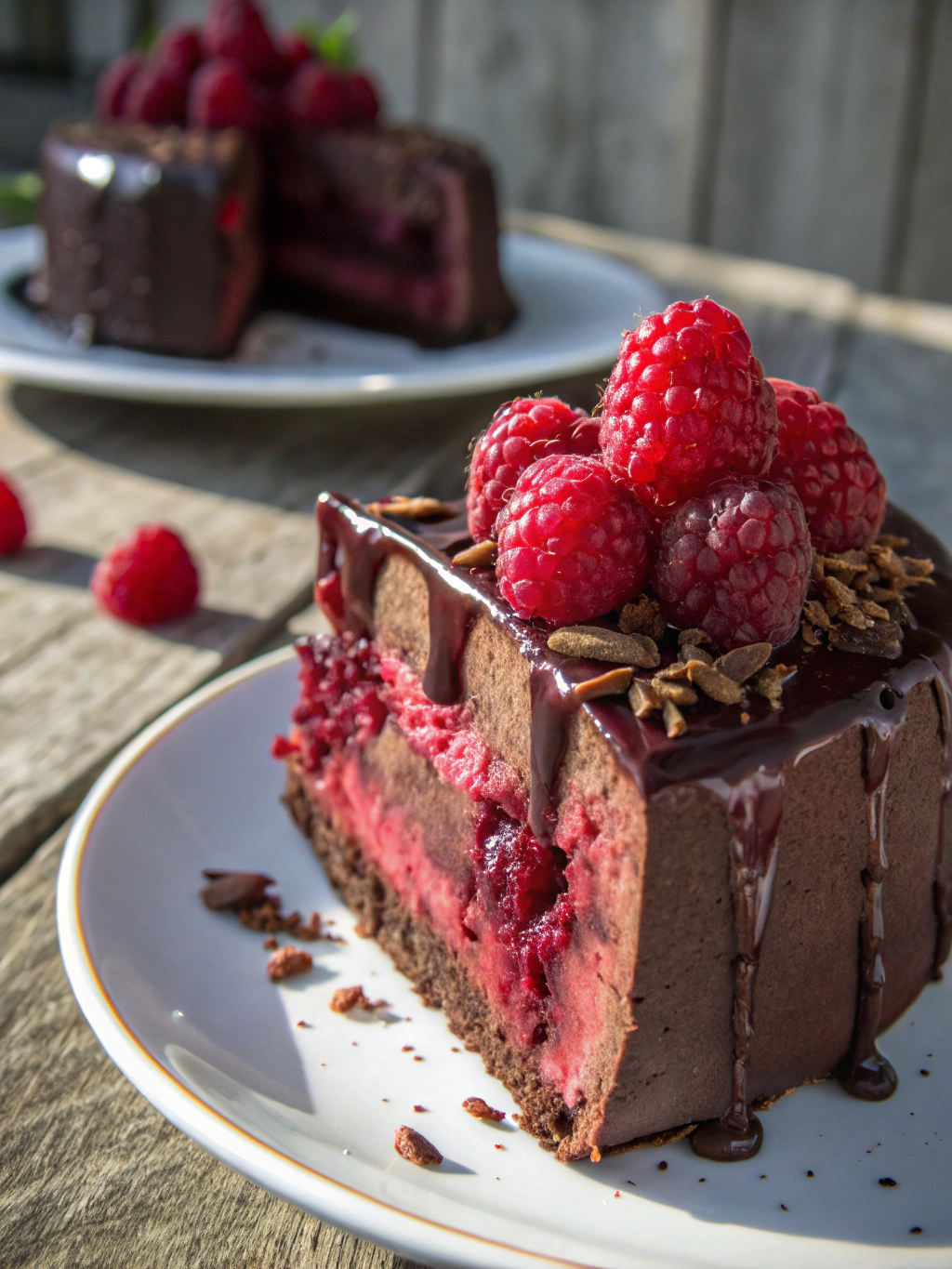 A decadent chocolate cake layered with raspberry filling and rich chocolate ganache.