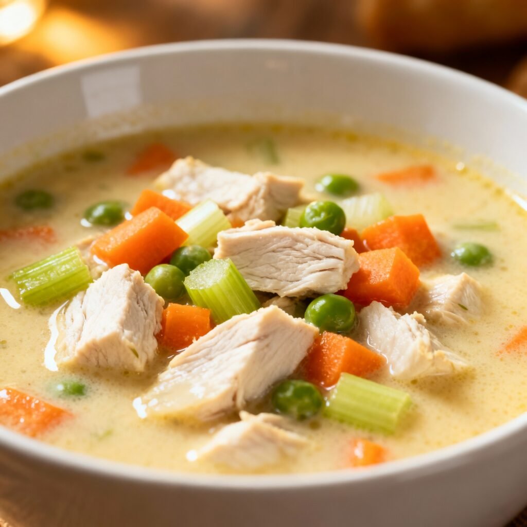 A comforting and creamy chicken soup loaded with tender vegetables and shredded chicken, perfect for a cozy meal.