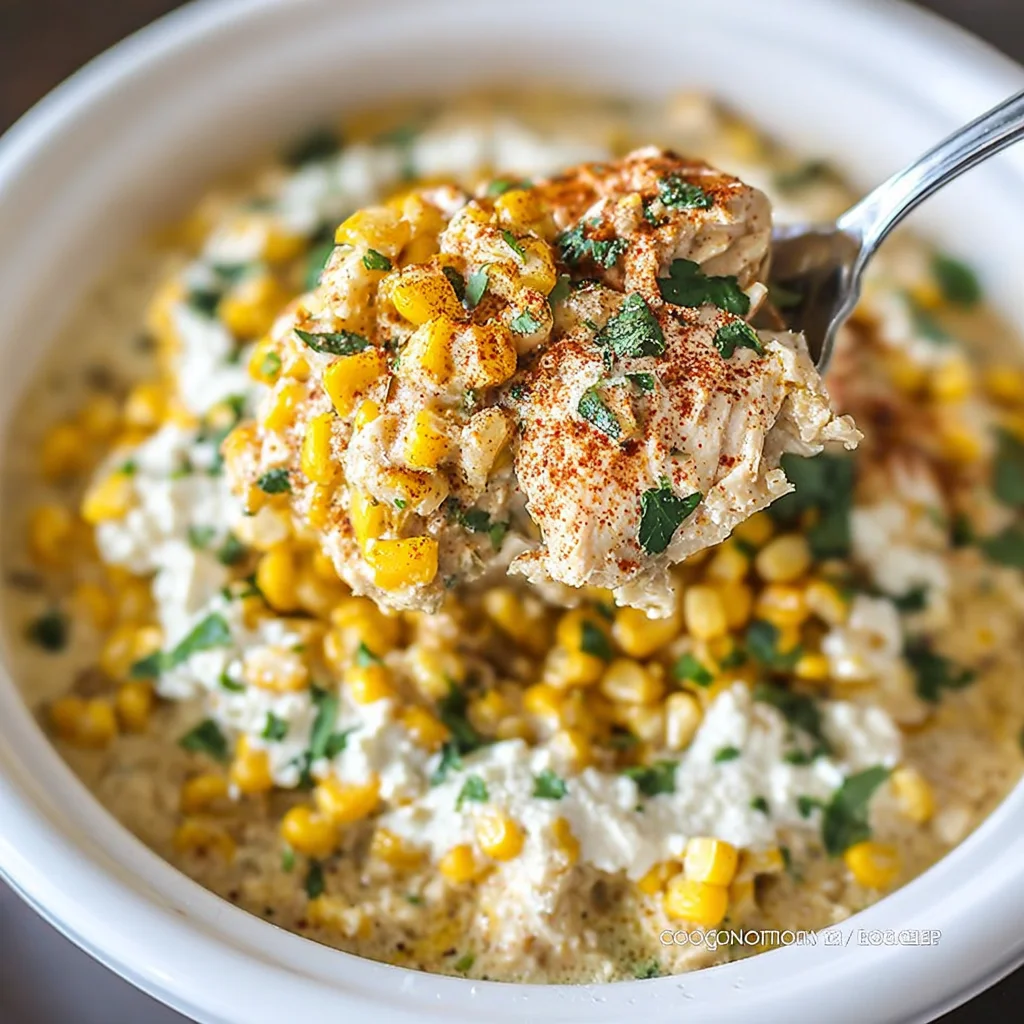 Turn off the slow cooker. Stir in the freshly chopped cilantro. Serve the creamy chicken and corn mixture hot, topped generously with the crumbled queso fresco. For the full street corn experience, a squeeze of lime juice over each bowl adds a bright, finishing touch.