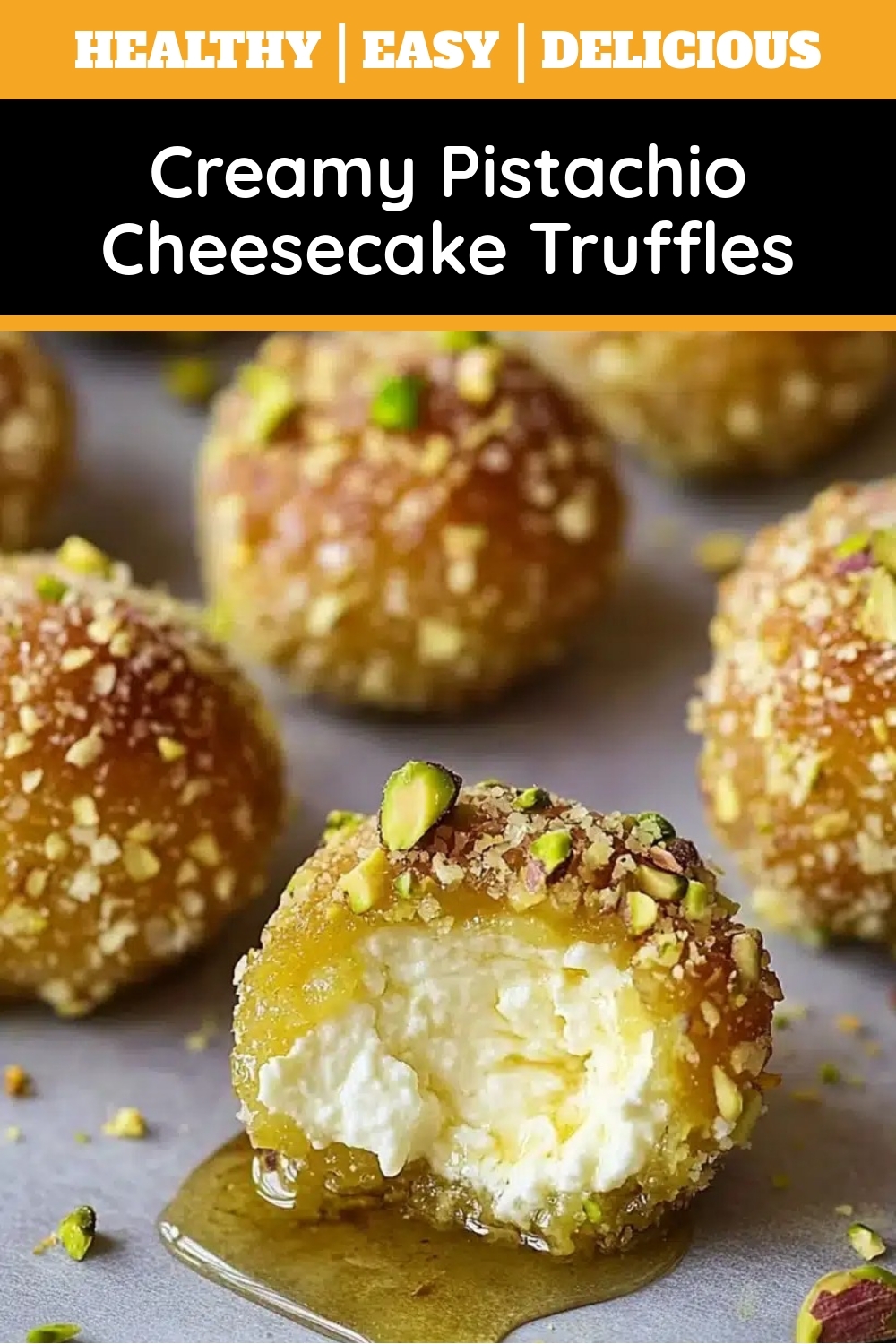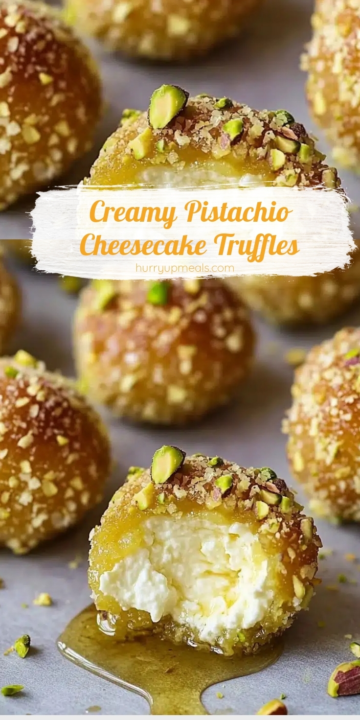 Delicious bite-sized truffles with a creamy cheesecake center and crunchy pistachio coating.