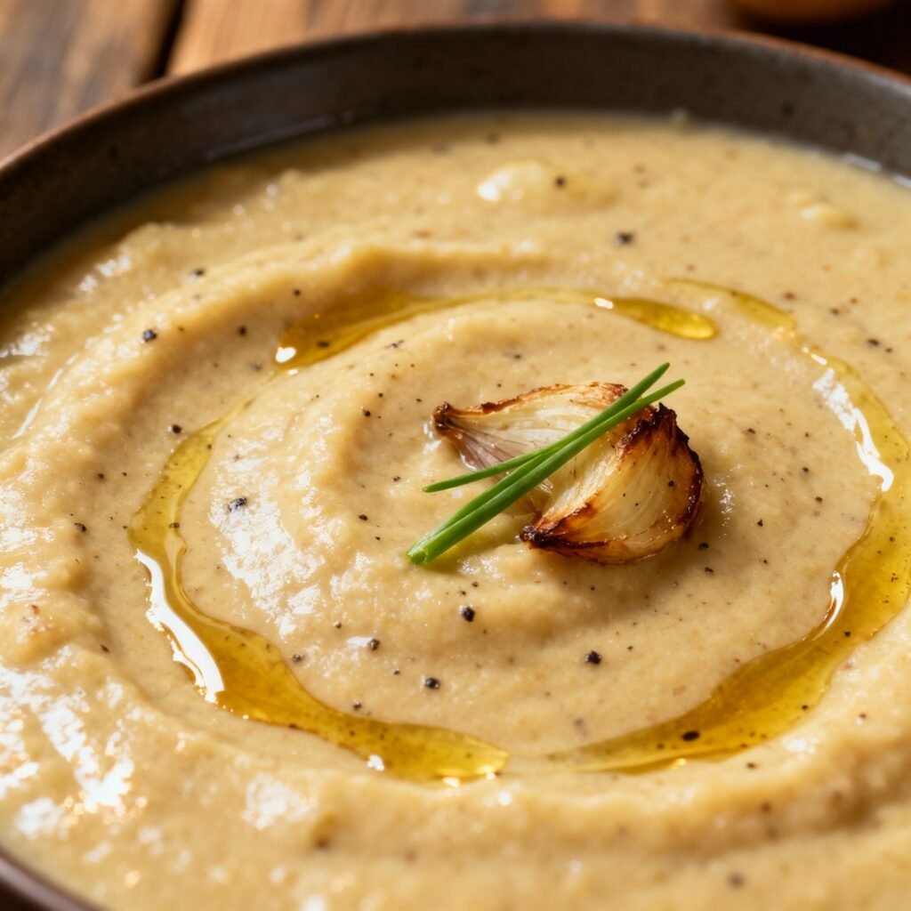 Ladle the hot CREAMY ROASTED GARLIC POTATO SOUP (VEGAN) into bowls. Top with fresh chives, cracked black pepper, and a drizzle of olive oil. Serve immediately for the best flavor and texture.