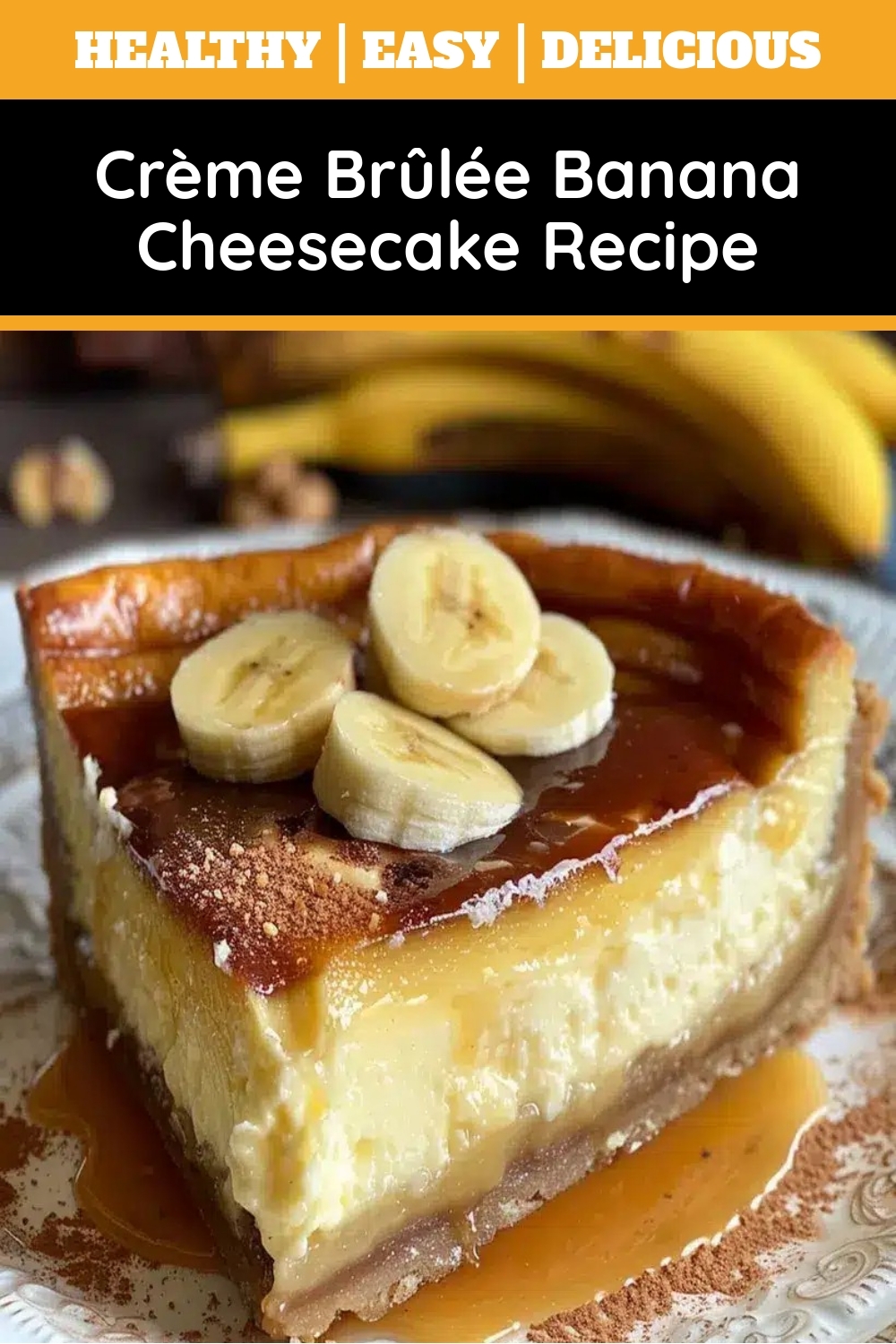 A decadent fusion of creamy cheesecake, ripe bananas, and a caramelized sugar topping.