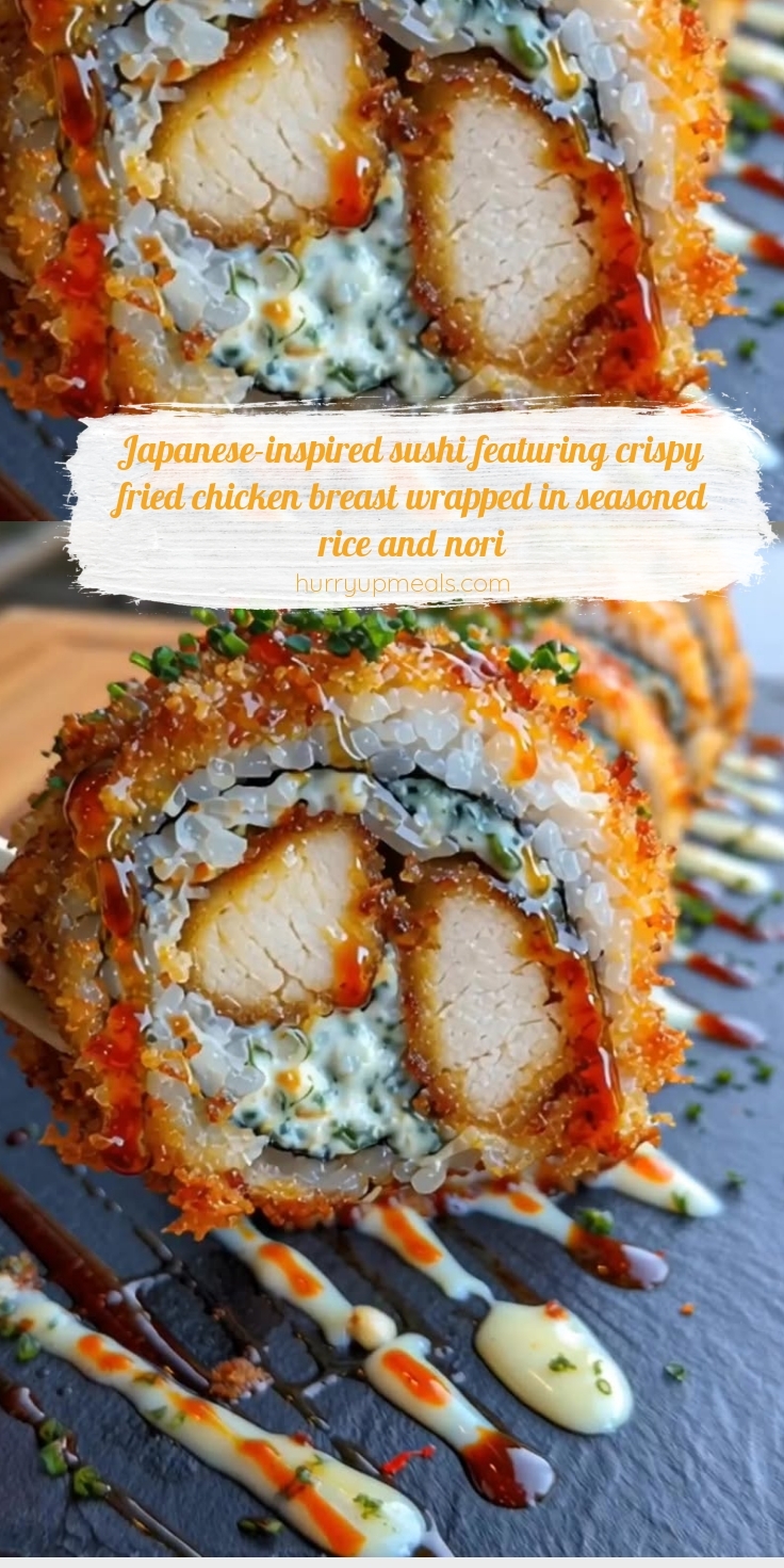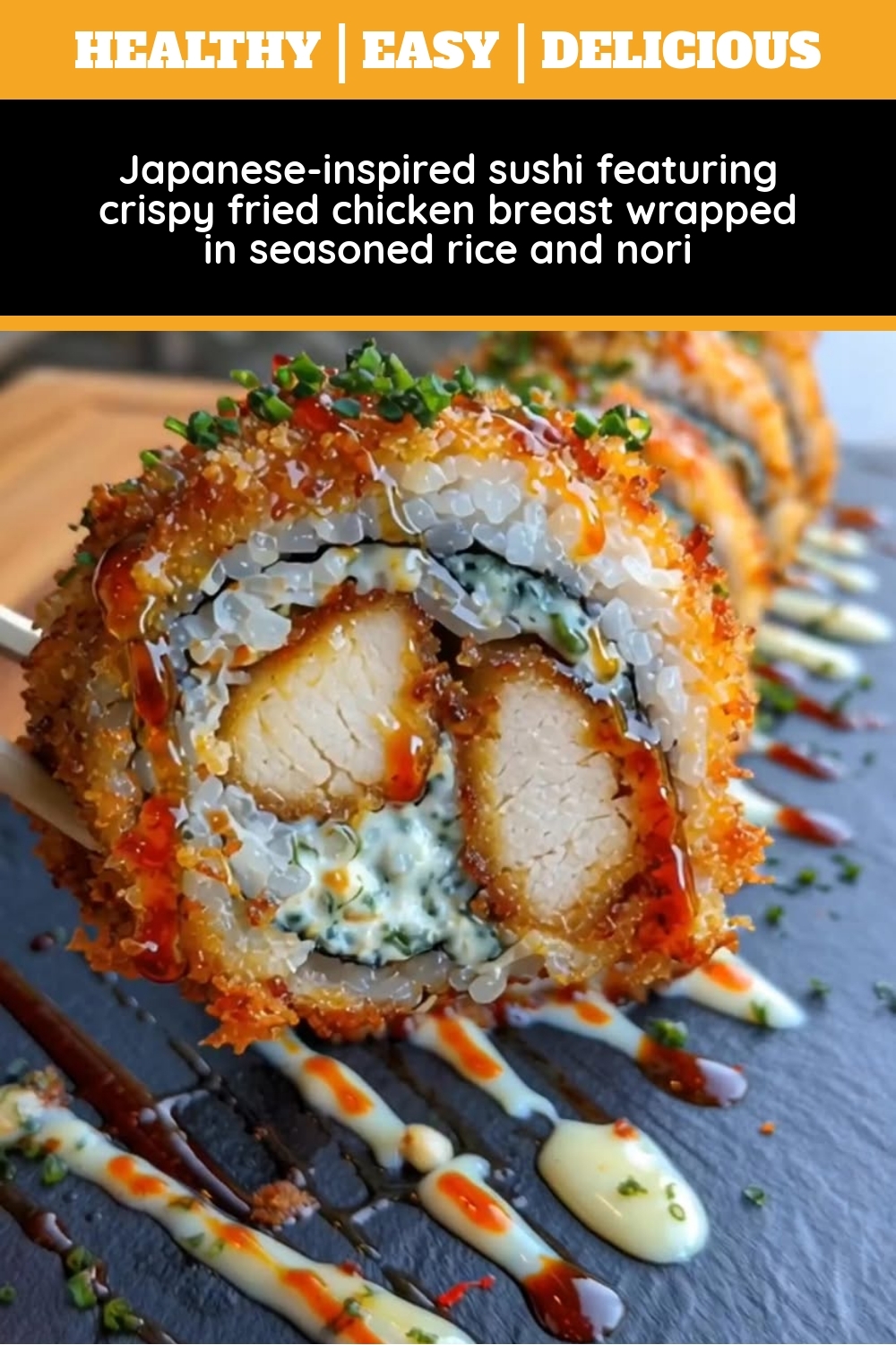 This Japanese-inspired sushi featuring crispy fried chicken breast wrapped in seasoned rice and nori delivers an incredible play of textures and flavors. You first experience the crisp, golden-brown crunch of the chicken, which then gives way to its surprisingly tender and juicy interior. The seasoned rice is slightly warm and wonderfully chewy, while its subtle tang from rice vinegar perfectly complements the rich, savory chicken. Wrapping it all is the crisp, briny nori, adding a whisper of the ocean that ties every element together. Each bite is a perfect harmony of savory, salty, and umami notes, especially when dipped in a creamy, spicy sauce. The overall experience is deeply satisfying because every component has a distinct role, from the fragrant sesame seeds to the airy crunch of panko breadcrumbs. Ultimately, this Japanese-inspired sushi featuring crispy fried chicken breast wrapped in seasoned rice and nori is a modern twist that feels both comforting and excitingly new with every single bite.