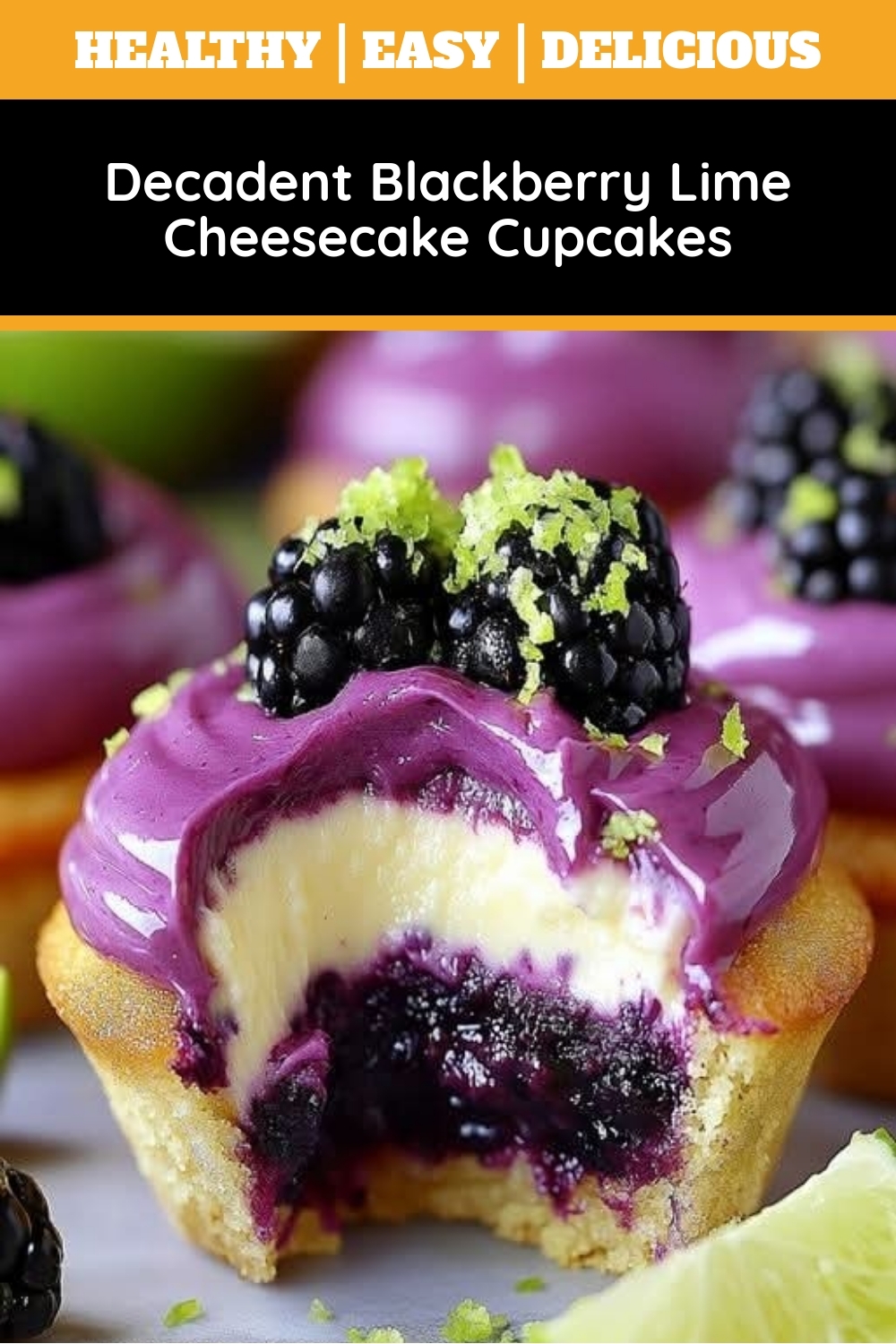 Creamy cheesecake cupcakes with a graham cracker crust, swirled with a vibrant blackberry lime compote and topped with a tangy lime glaze.