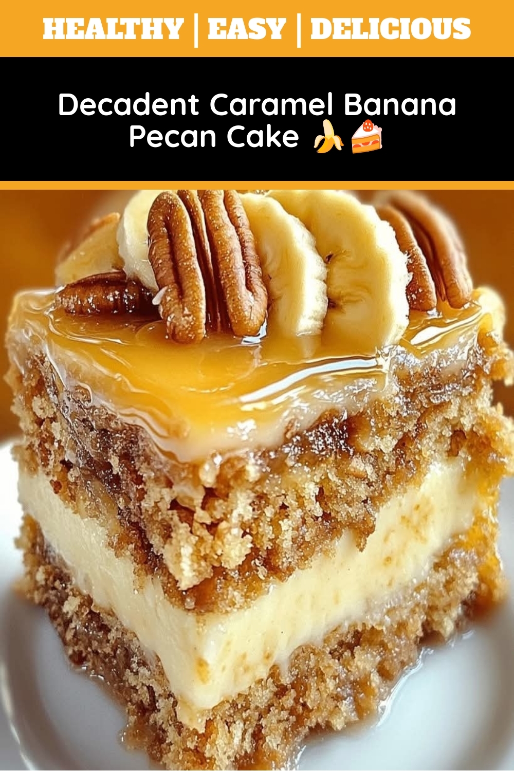 For a truly stunning presentation, serve each slice of Decadent Caramel Banana Pecan Cake warm. Consequently, this allows the rich caramel to gently pool around the plate. Moreover, a final dusting of powdered sugar just before serving adds a beautiful, elegant touch. Alternatively, garnish with a few extra toasted pecans and a thin slice of fresh banana for a pop of color and texture.