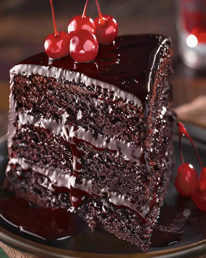 This Decadent Chocolate Cherry Cake greets you with an incredibly rich and intoxicating aroma because the deep scent of premium cocoa melds perfectly with the sweet, slightly tart fragrance of ripe cherries. When you take your first bite, your fork glides through an exceptionally tender and moist crumb, revealing a surprisingly airy texture that simply melts on your tongue. Each mouthful is a luxurious symphony of flavors where the intense, bittersweet chocolate notes are brilliantly punctuated by juicy, bright bursts of cherry. The experience is further enhanced by the subtle, fragrant hint of vanilla and a touch of warmth from any added spice, so it creates a complex and utterly satisfying dessert. Ultimately, the final bite of this Decadent Chocolate Cherry Cake leaves a lingering, creamy chocolate sensation that makes you eagerly anticipate the next slice.