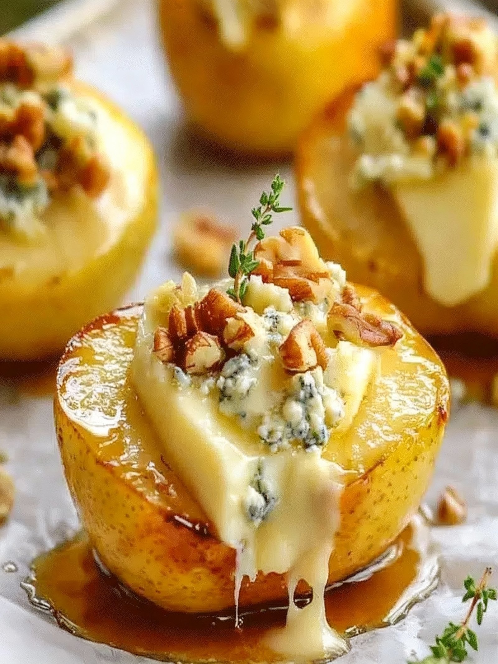 Tender roasted pears drizzled with olive oil, stuffed with creamy blue cheese and toasted walnuts, then baked until the cheese melts. Served on a bed of mixed greens with a honey drizzle and fresh thyme for a perfect balance of sweet and savory flavors.