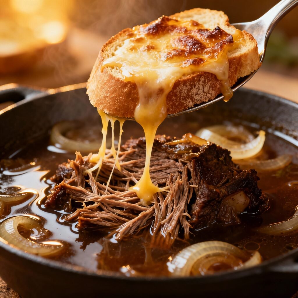 A rich and velvety soup featuring fall-off-the-bone tender short ribs slow-cooked with sweet Vidalia onions, creating a deeply beefy and sweet broth topped with melted Gruyère cheese.