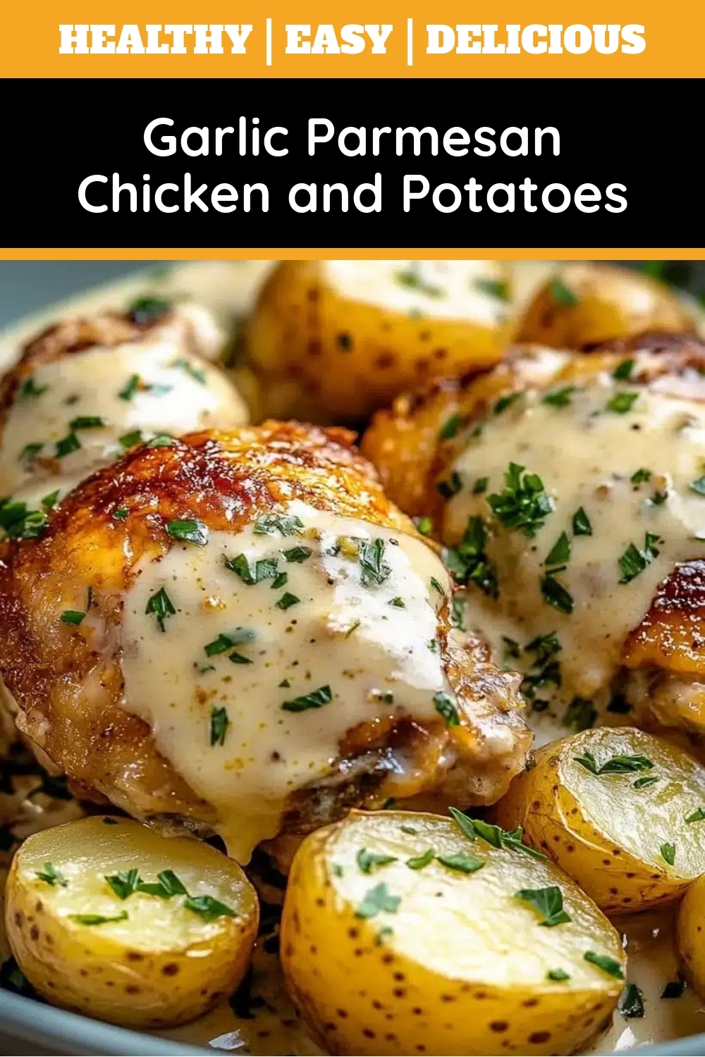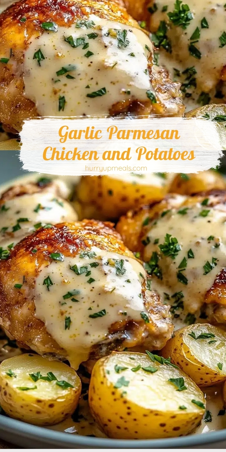 A savory one-pan dish featuring tender chicken and crispy potatoes coated in a garlic parmesan sauce.