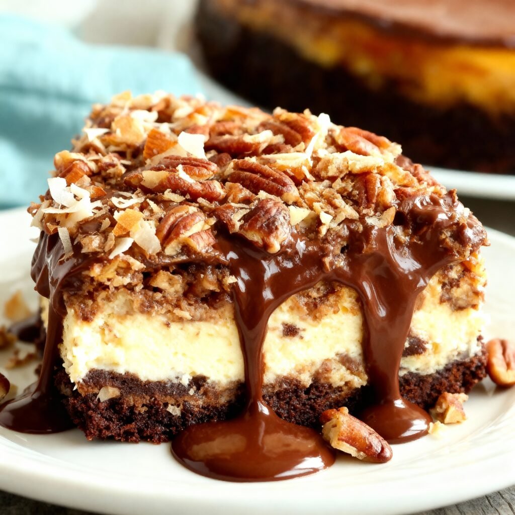A rich and creamy cheesecake with a chocolate crust, coconut-pecan topping, and a decadent chocolate filling, inspired by the classic German chocolate cake.