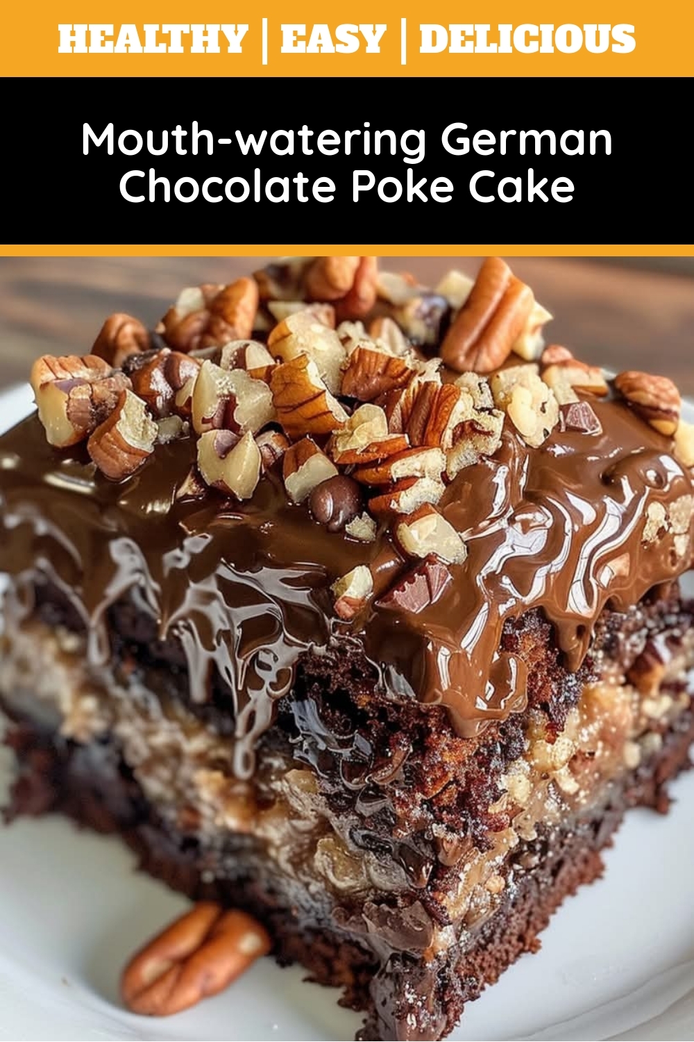 A Mouth-watering German Chocolate Poke Cake typically includes a chocolate cake base, sweetened condensed milk, coconut-pecan frosting, and sometimes caramel or chocolate drizzle. The cake is poked after baking to allow the condensed milk to soak in, creating a rich, moist texture.