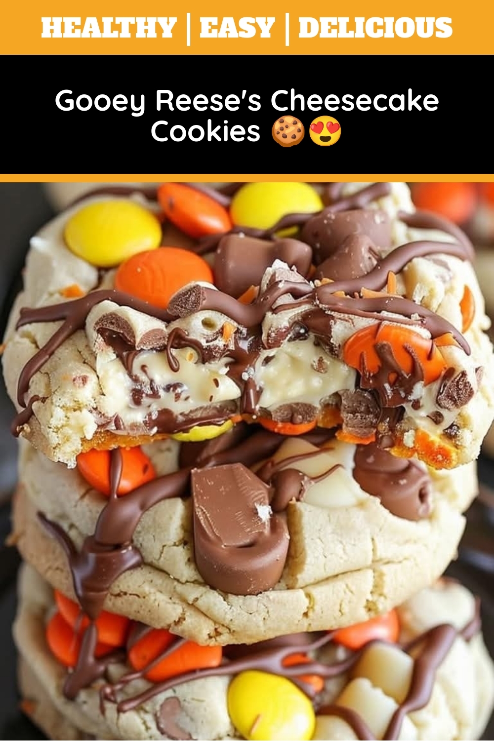 Soft, gooey cookies with a creamy cheesecake center and chunks of Reese’s peanut butter cups.