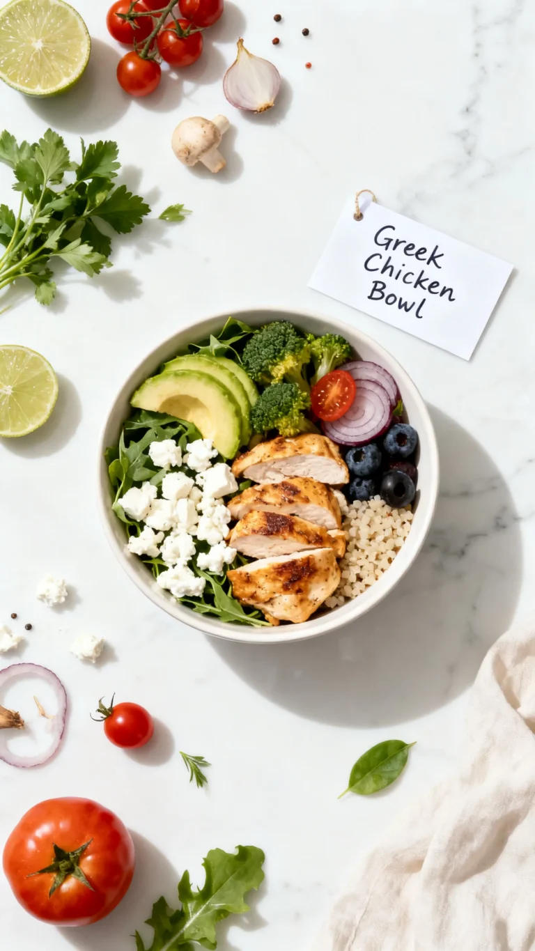 Note: This Greek Chicken Bowl provides 38g of high-quality protein per serving, supporting muscle repair and satiety. Sodium can be reduced by omitting the feta cheese and using low-sodium salt in the marinade. Estimates are based on typical ingredients and serving size. Values may vary.