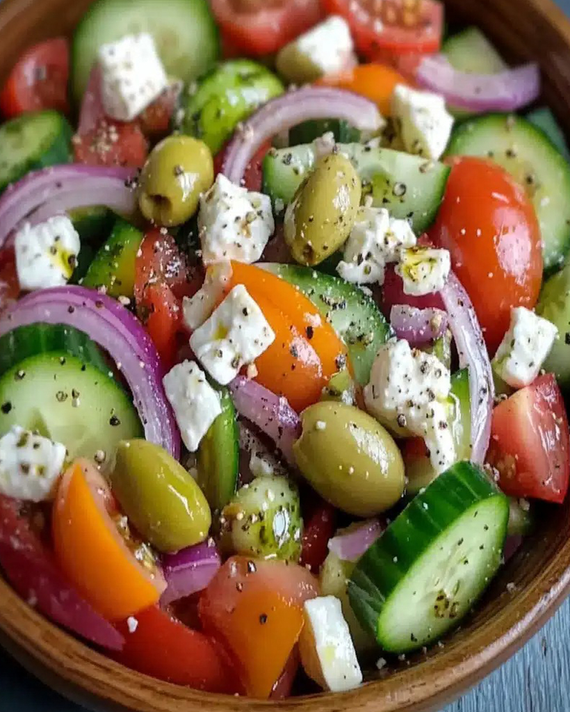 A rustic and refreshing salad featuring crisp vegetables, briny olives, and tangy feta cheese, dressed simply with olive oil and lemon juice.