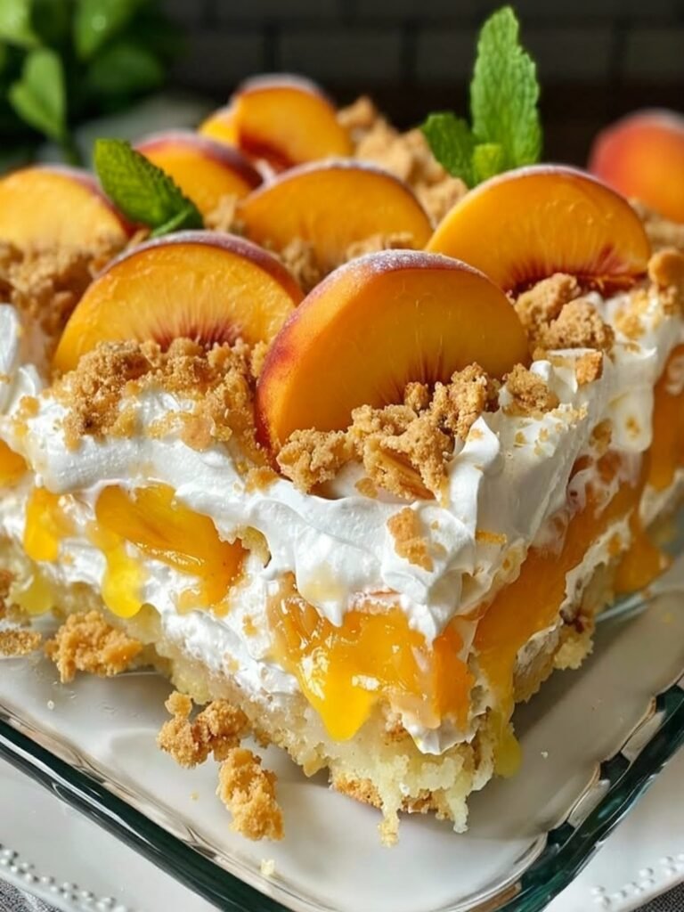 A delightful poke cake with layers of vanilla cake, peach pie filling, whipped cream, fresh peaches, and a crunchy graham cracker topping, perfect for summer gatherings.