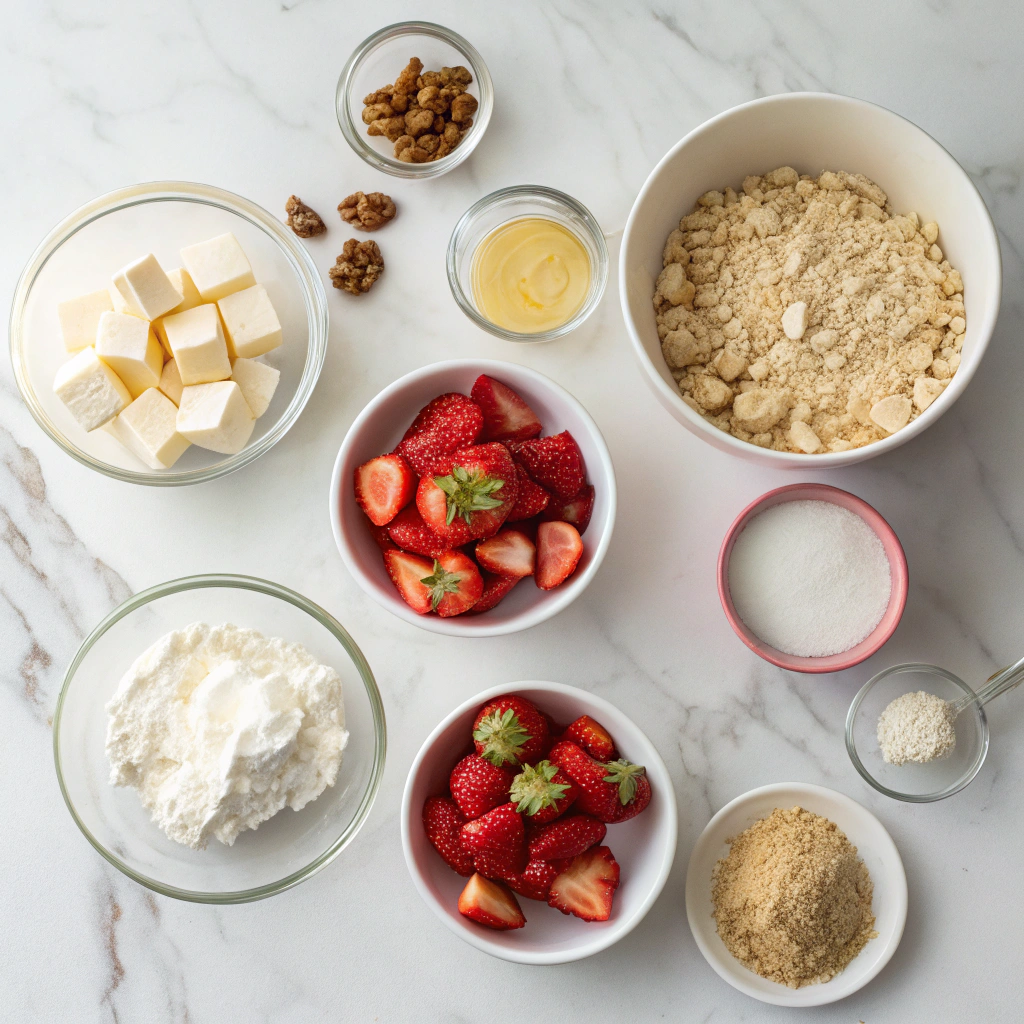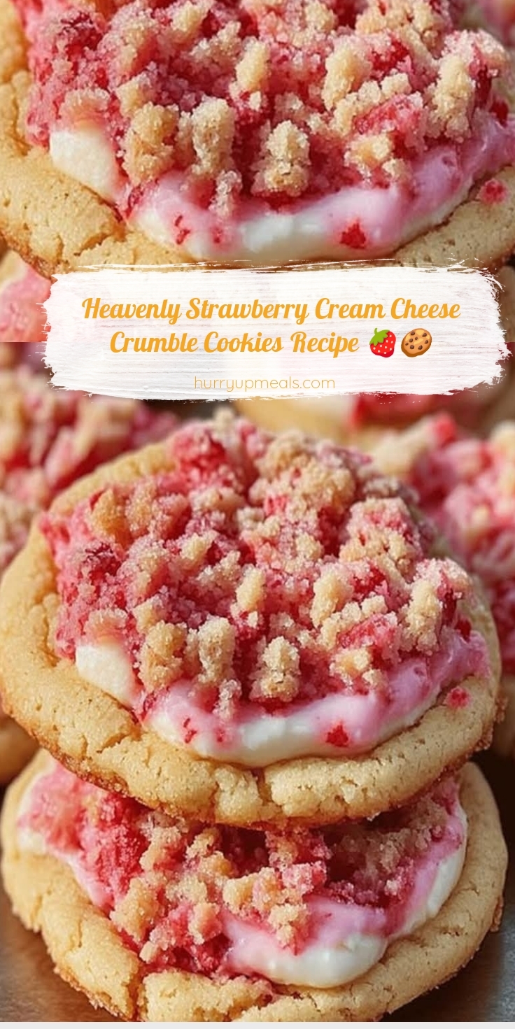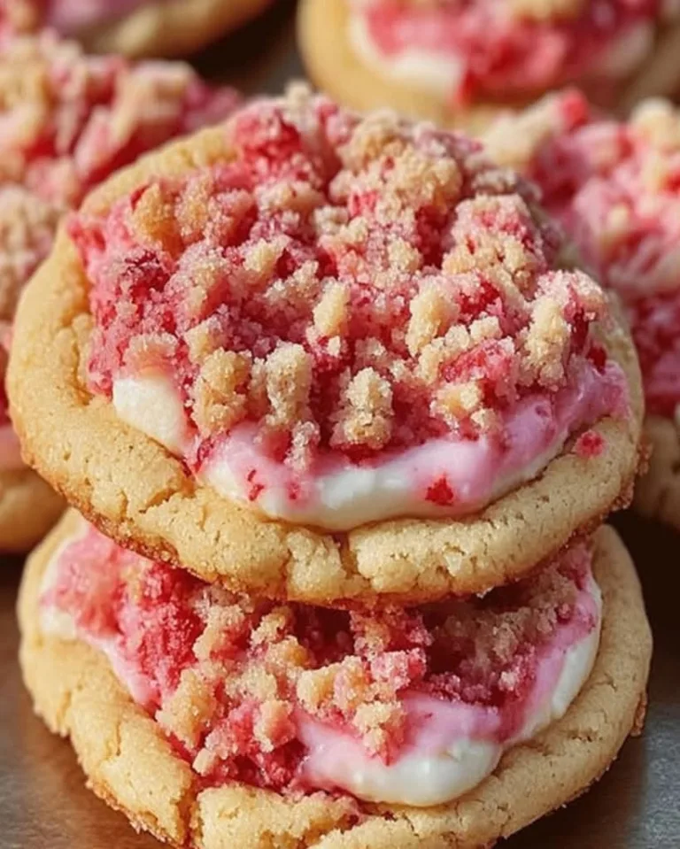 Soft, buttery cookies with a cream cheese center, fresh strawberry pieces, and a sweet crumble topping.