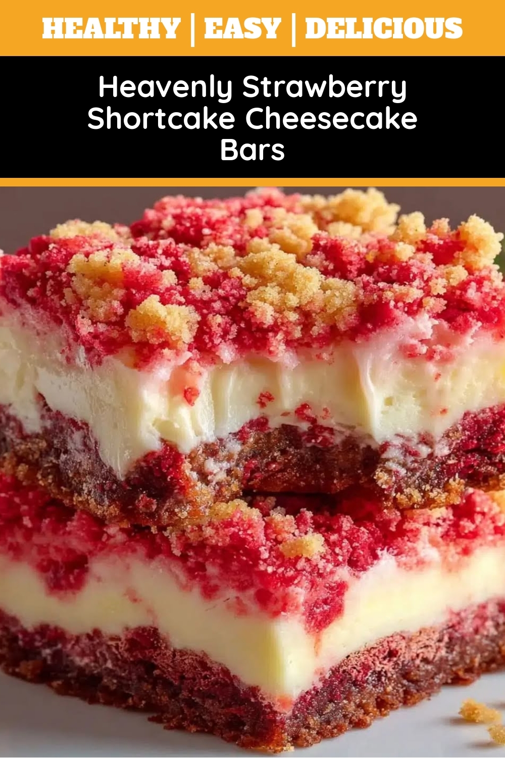 A delightful fusion of strawberry shortcake and creamy cheesecake in bar form.