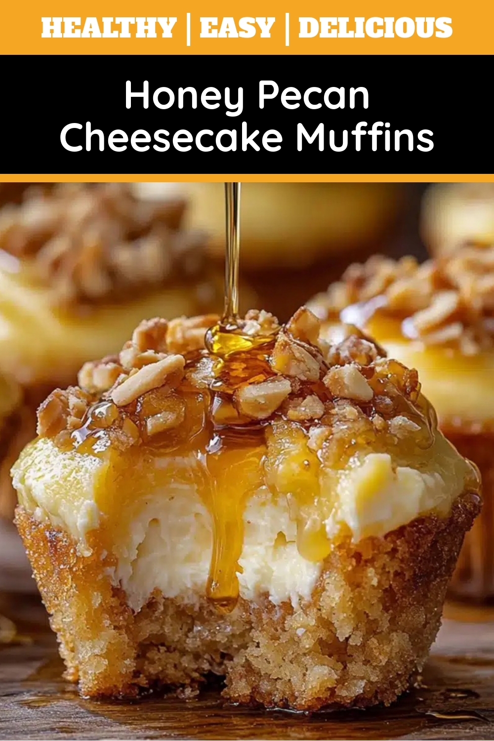 Deliciously moist muffins with a creamy cheesecake swirl and crunchy honey-glazed pecan topping.