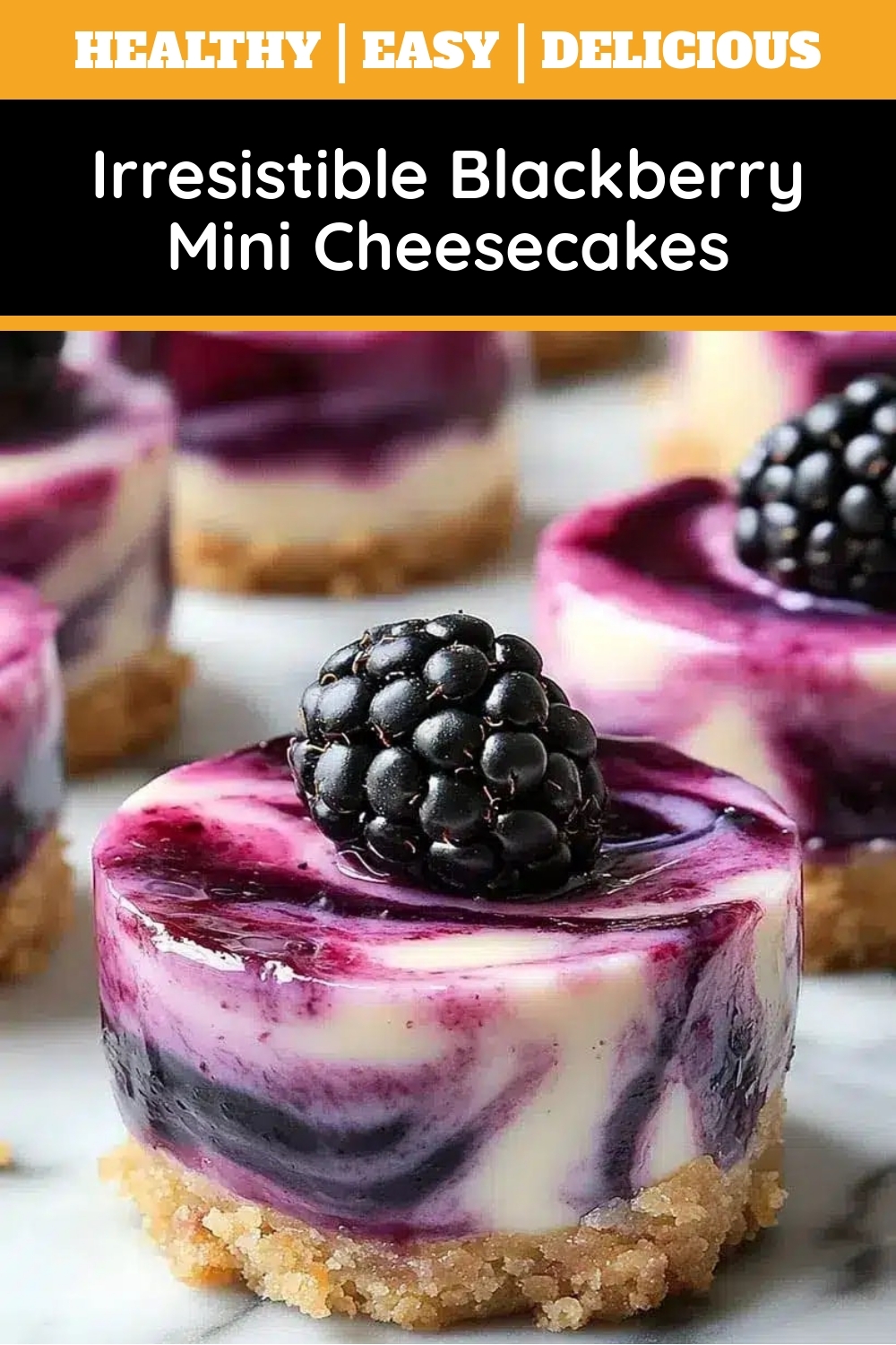 First, preheat your oven to 325°F and line a muffin tin with cupcake liners. Meanwhile, crush graham crackers into fine crumbs and mix them with melted butter and a pinch of sugar. Press this mixture firmly into the liners to form the crust, then bake for 5 minutes to set. While the crust cools, beat cream cheese until smooth, then gradually add sugar, vanilla, and eggs. For a lighter texture, gently fold in whipped cream. Spoon the filling over the crusts, leaving a little room at the top. Bake for 18–20 minutes until the centers are just set. Once cooled, top each mini cheesecake with fresh blackberry compote or a simple blackberry drizzle. For best results, chill them for at least 2 hours before serving. To save time, prepare the crust and filling the night before, then assemble and bake the next day. If you’re short on time, skip the compote and use store-bought blackberry jam instead—just warm it slightly for easy drizzling.