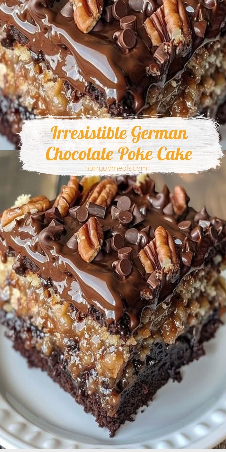 Irresistible German Chocolate Poke Cake is a symphony of flavors and textures that delight every bite. The tender, moist chocolate cake absorbs a luscious caramel-coconut filling, creating a rich and gooey center. When you take a forkful, the velvety smoothness of the cake contrasts beautifully with the chewy coconut-pecan topping. Each slice bursts with deep cocoa notes, balanced by the sweet, buttery aroma of toasted pecans. Because the cake is poked, it soaks up the filling, ensuring every mouthful is infused with decadent flavor. The toasted coconut adds a subtle crunch, while the chocolate ganache drizzle delivers a glossy, creamy finish. Even though it’s indulgent, the airy crumb keeps it from feeling heavy. The fragrance alone—warm chocolate mingling with caramelized sugar—will make your kitchen smell like a bakery. Whether served chilled or at room temperature, Irresistible German Chocolate Poke Cake is a showstopper that satisfies both chocolate lovers and those who crave a touch of nutty sweetness.