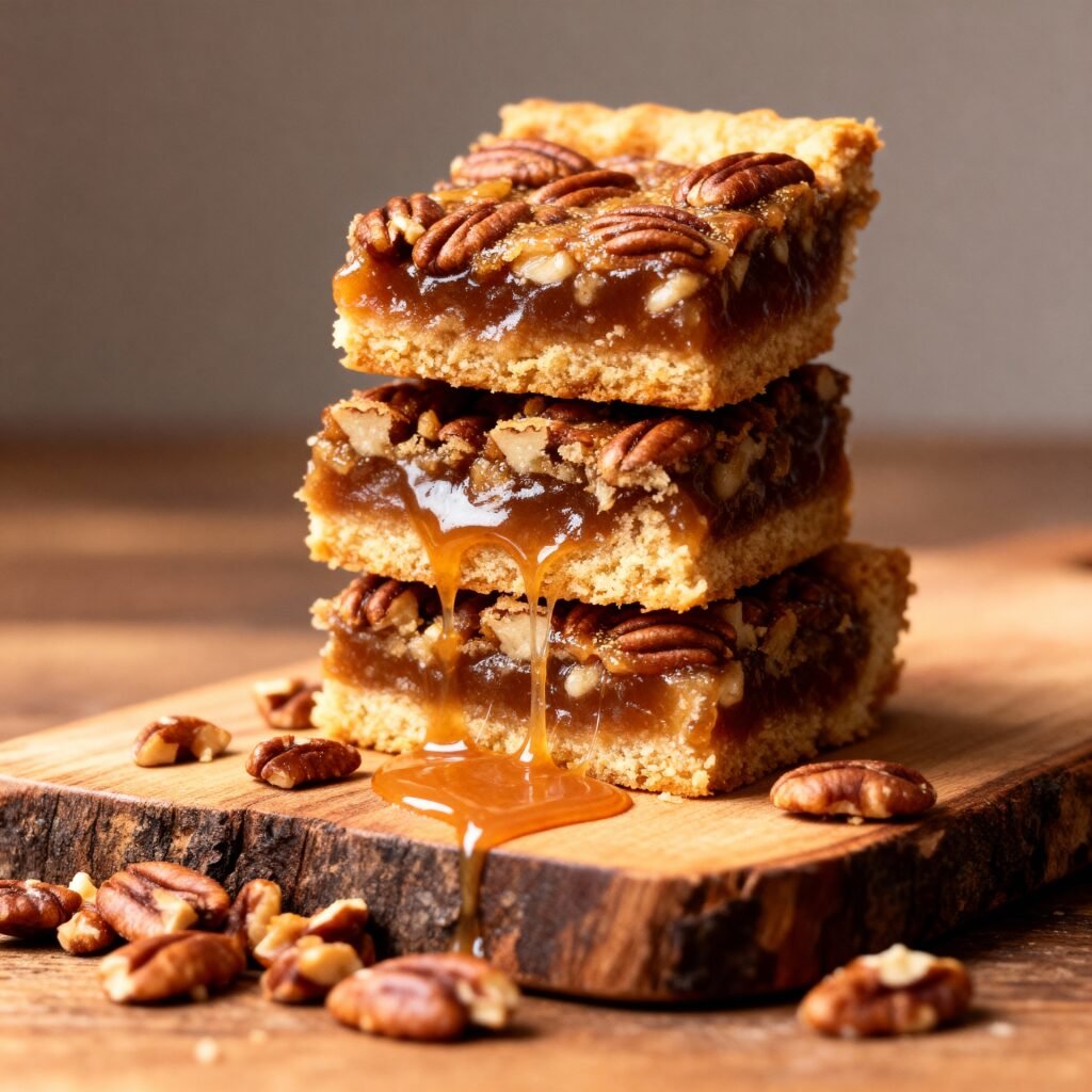 Layered dessert bars with a buttery shortbread crust topped with a gooey sweet pecan pie filling, easy to make for a delicious holiday treat.