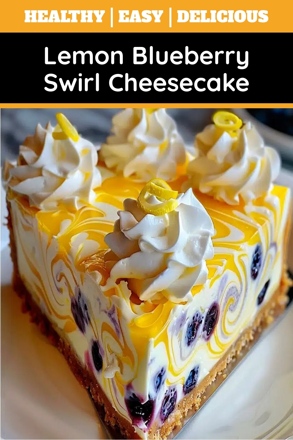 A creamy and tangy cheesecake with a vibrant blueberry swirl and refreshing lemon flavor.