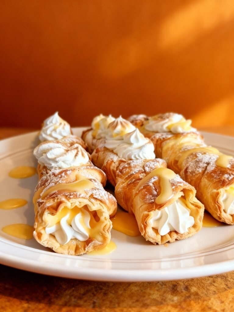 These zesty Lemon Meringue Pie Cannolis feature a crisp, golden shell filled with a bright, creamy lemon filling that balances sweet and tart flavors perfectly.