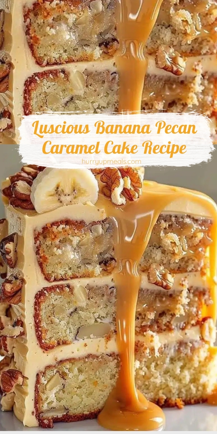 This Luscious Banana Pecan Caramel Cake Recipe is a decadent layer cake that masterfully combines the moist, familiar comfort of banana bread with the sophisticated elegance of a professional bakery dessert. Its true uniqueness lies in the homemade salted caramel sauce, which is not only swirled into the batter but also used to soak the layers and frost the entire cake, ensuring maximum flavor in every single bite. The addition of toasted pecans provides a wonderful crunch that contrasts beautifully with the cake’s tender crumb. This show-stopping dessert perfectly aligns with our mission at Hurry Up Meals to create impressive, from-scratch dishes that are surprisingly straightforward to execute. It’s an ideal choice for celebrations, potlucks, or whenever you need an extraordinary easy dessert recipe that looks like you spent all day in the kitchen. While it tastes incredibly indulgent, it utilizes common pantry staples, much like our favorite quick breakfast ideas, proving that incredible food doesn’t have to be complicated.