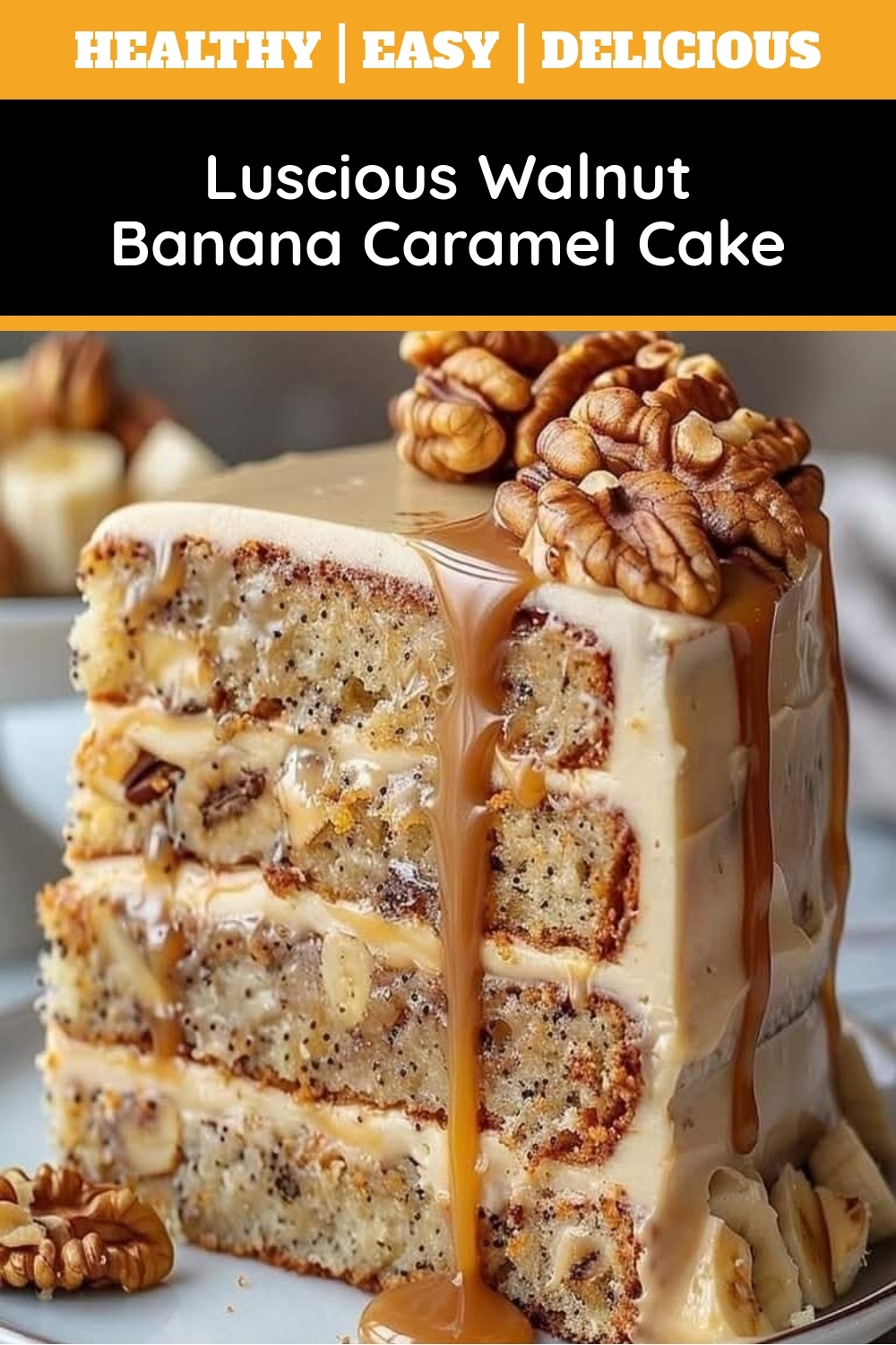 The Luscious Walnut Banana Caramel Cake is a symphony of flavors and textures that delight every bite. Imagine sinking your fork into a tender, moist crumb infused with ripe bananas, their natural sweetness mingling with rich caramel swirls. The walnuts add a satisfying crunch, while their earthy depth balances the cake’s sweetness. Each slice offers a creamy caramel drizzle that melts into the cake, creating a luscious contrast to the airy, fluffy layers. The aroma alone is irresistible—warm banana, toasted nuts, and buttery caramel fill the kitchen, making it impossible to resist a second slice. Because the bananas are perfectly ripe, they lend a fragrant, almost honey-like quality, while the caramel adds a velvety richness. Even though the cake is decadent, the walnuts keep it grounded with their nutty crispness. When you take a bite, the textures play harmoniously—soft cake, gooey caramel, and crunchy walnuts—making the Luscious Walnut Banana Caramel Cake a truly unforgettable treat.