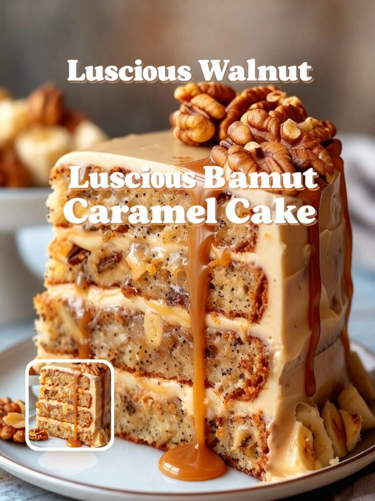 A moist and flavorful banana cake layered with crunchy caramelized walnuts, combining the sweetness of ripe bananas with rich caramel and nutty textures for a luscious dessert experience.