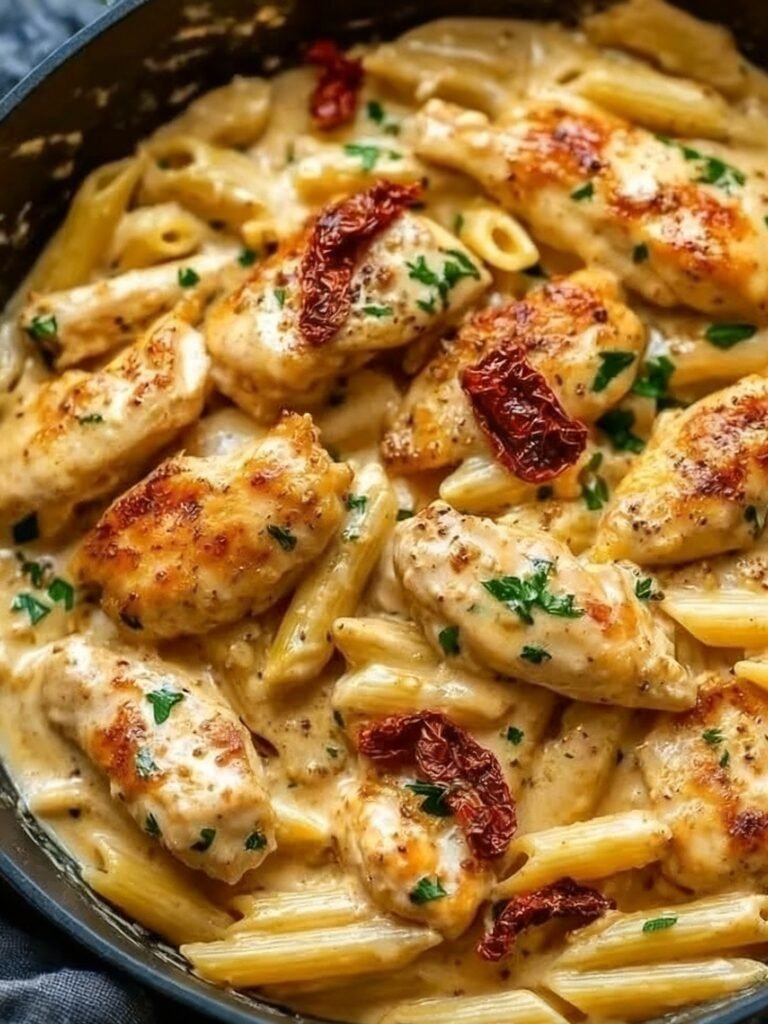 A rich and creamy one-pot pasta dish featuring pan-seared Italian-seasoned chicken simmered in a garlic Parmesan sun-dried tomato sauce, combined with pasta and spinach for a comforting and flavorful meal.