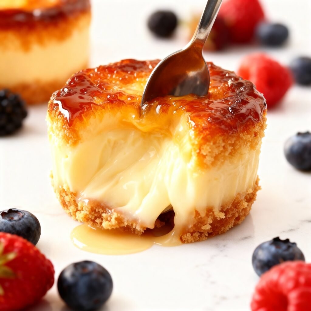 Mini Creme Brulee Cheesecakes combine a graham cracker crust, creamy vanilla cheesecake filling, and a crunchy caramelized sugar topping for a decadent bite-sized dessert.