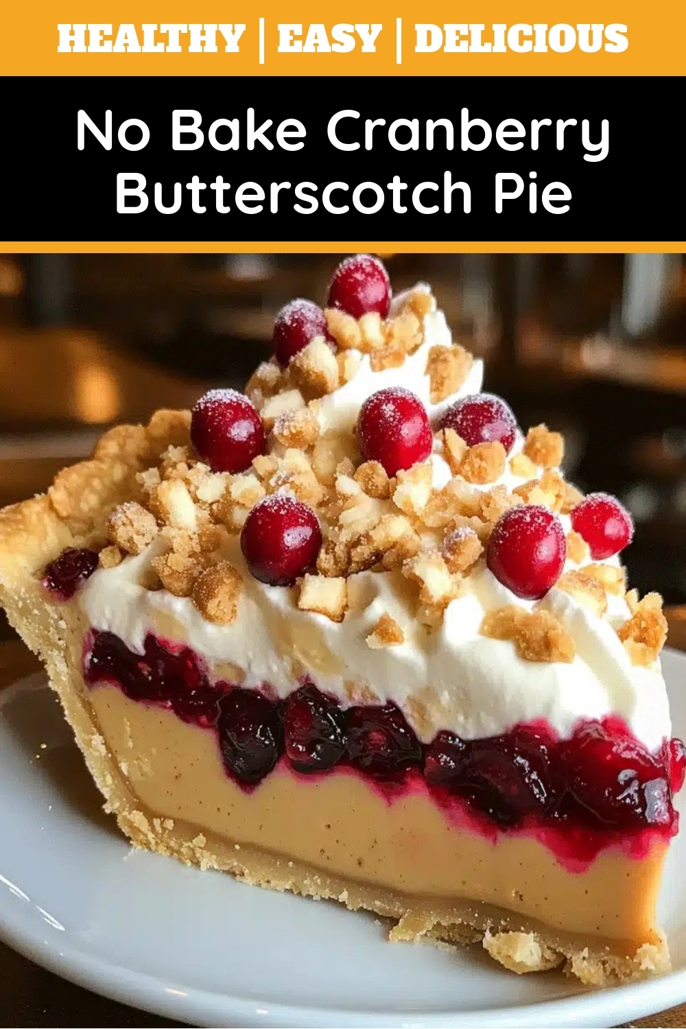 A graham cracker or shortbread crust works perfectly with No Bake Cranberry Butterscotch Pie. The buttery crunch complements the creamy filling, and it holds up well without baking.
