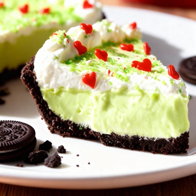 Just before serving, garnish the top of the pie with red candy hearts or sprinkles for the classic “Grinch” touch. Slice with a sharp knife dipped in hot water for neat pieces.