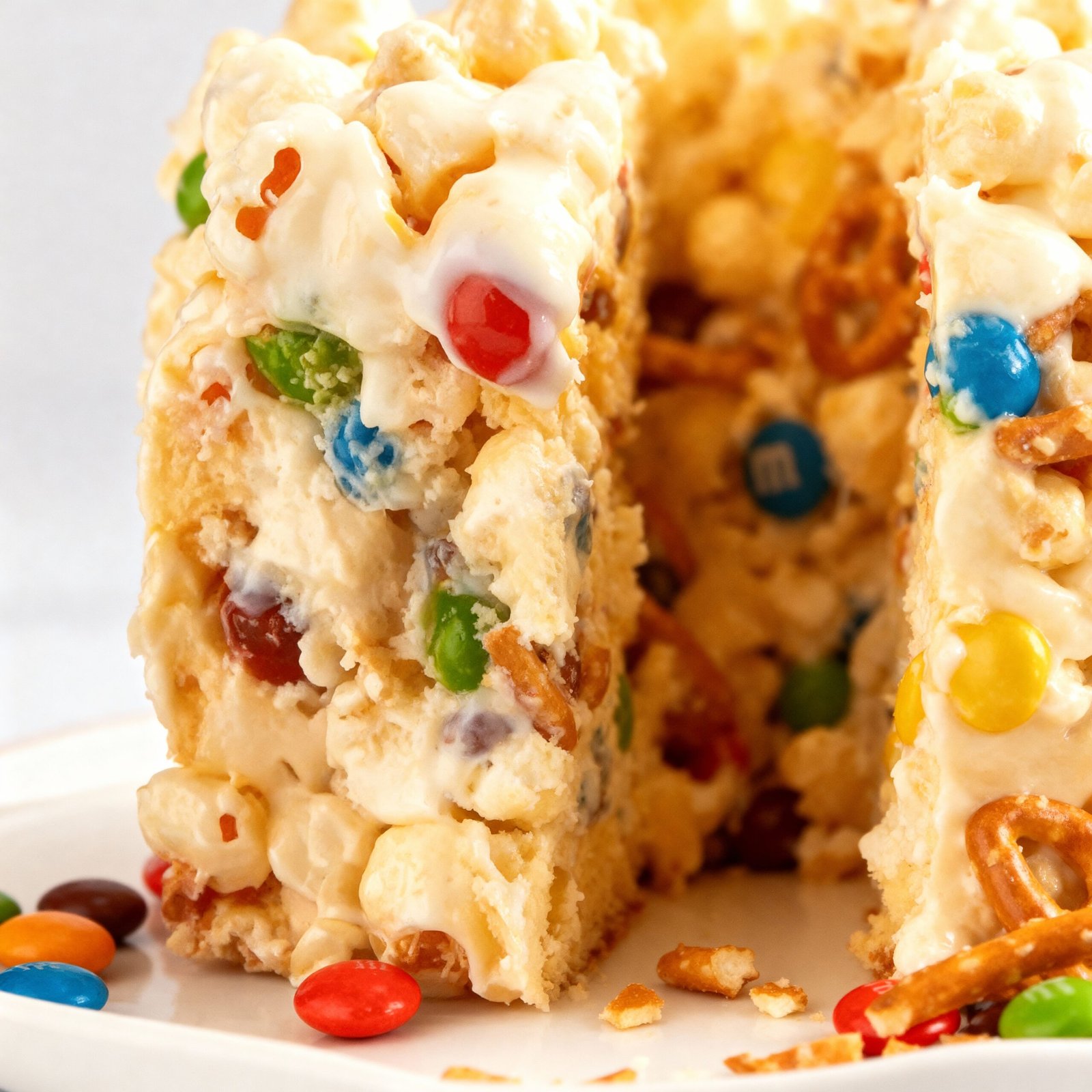 A super easy no bake dessert that’s perfect for parties, featuring a delightful mix of popcorn, pretzels, M&M’s, and marshmallows pressed into a bundt pan for a fun, sliceable treat.