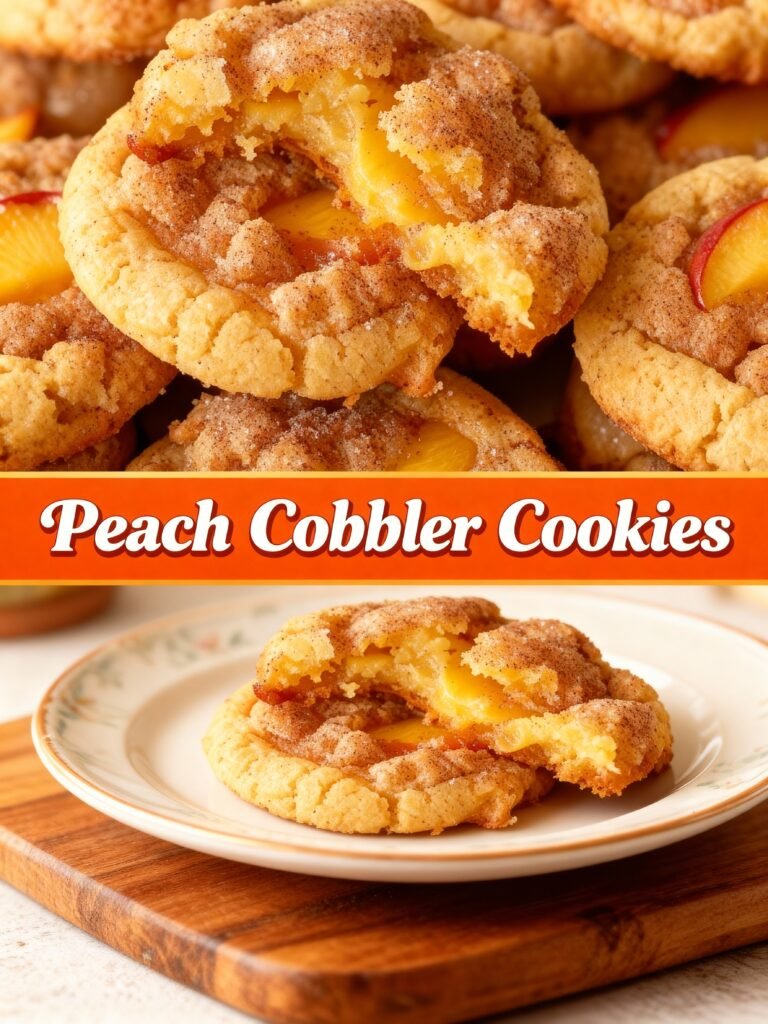 Soft, chewy cookies packed with fresh or canned peaches and a hint of cinnamon, inspired by classic peach cobbler flavors.