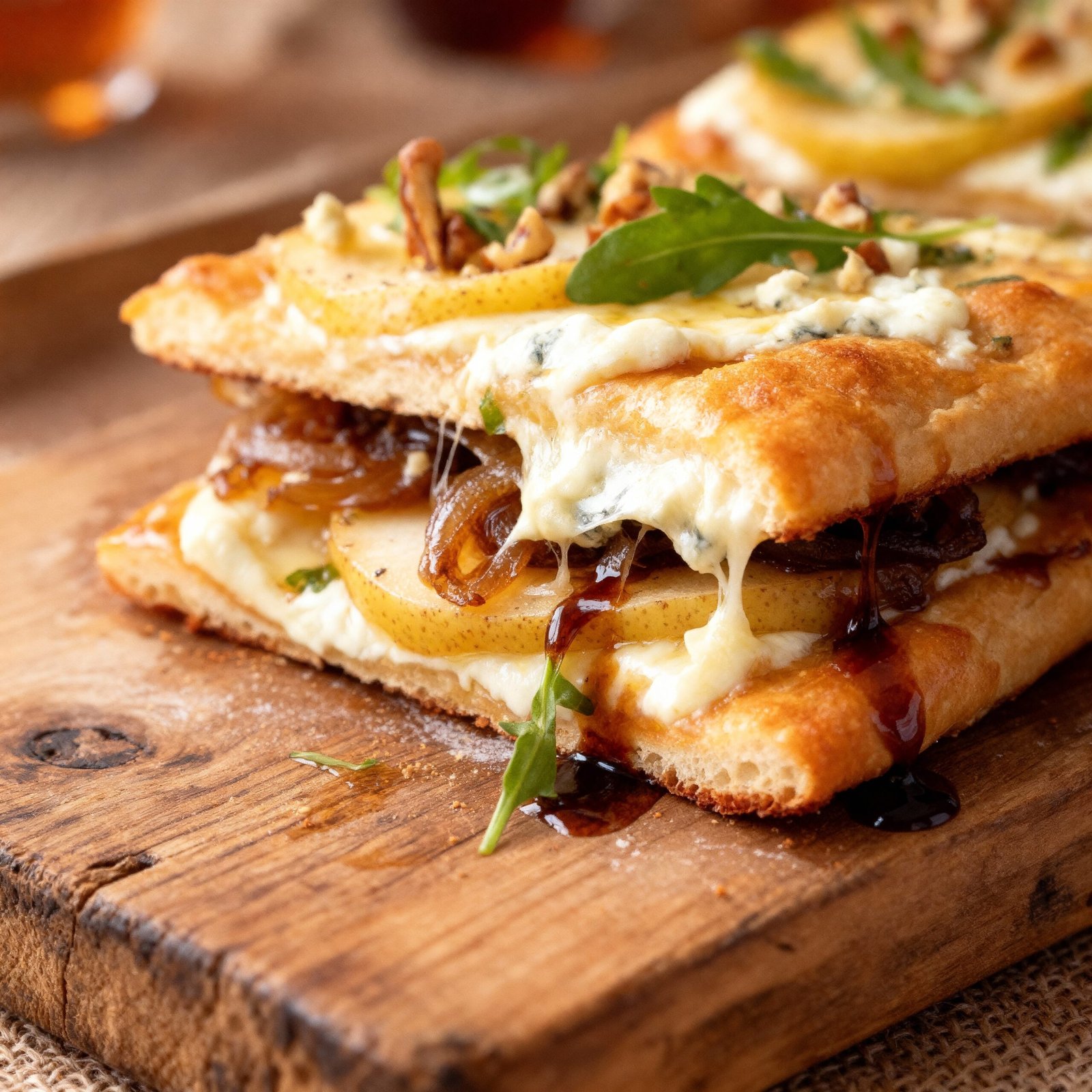 A savory flatbread featuring caramelized onions, thinly sliced pear, walnuts, gorgonzola cheese, topped with arugula and a balsamic glaze.