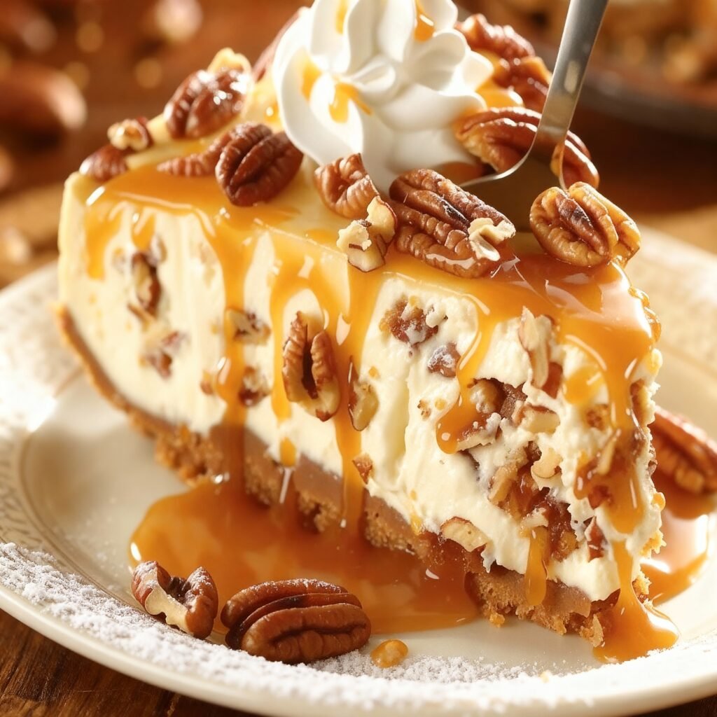 A rich and creamy cheesecake with a pecan crust, sweet caramel flavor, and a nutty pecan topping, baked perfectly for a decadent dessert.