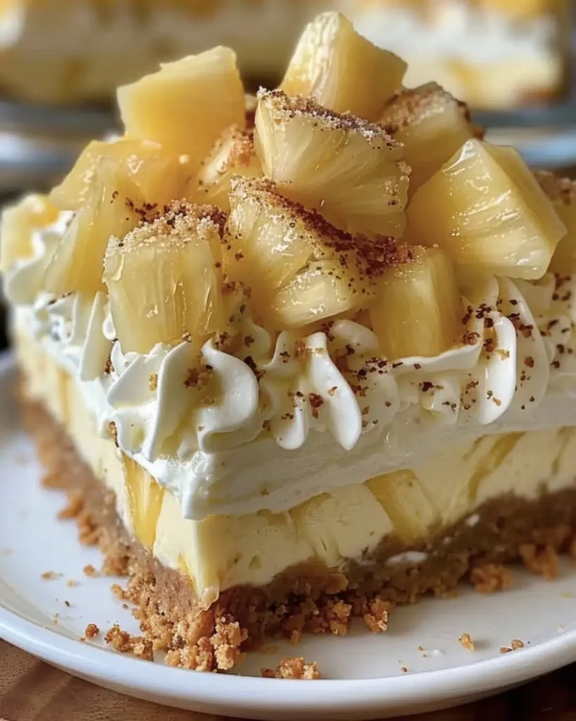 This Pineapple Cheesecake Recipe delivers a symphony of flavors and textures that will delight your senses. The creamy, velvety cheesecake filling melts in your mouth, while the buttery graham cracker crust adds a satisfying crunch. Fresh pineapple chunks bring a burst of tropical sweetness, balancing the rich, tangy cream cheese perfectly. When you take a bite, the fragrant vanilla and citrusy zest elevate the experience, making each forkful irresistible. Even though the cheesecake is decadently smooth, the juicy pineapple provides a refreshing contrast, so every bite feels light and indulgent at the same time. The golden-brown top adds a slight caramelized note, while the chilled interior stays luxuriously airy. Whether you serve it chilled or slightly softened, this Pineapple Cheesecake Recipe is a dessert that keeps you coming back for more.