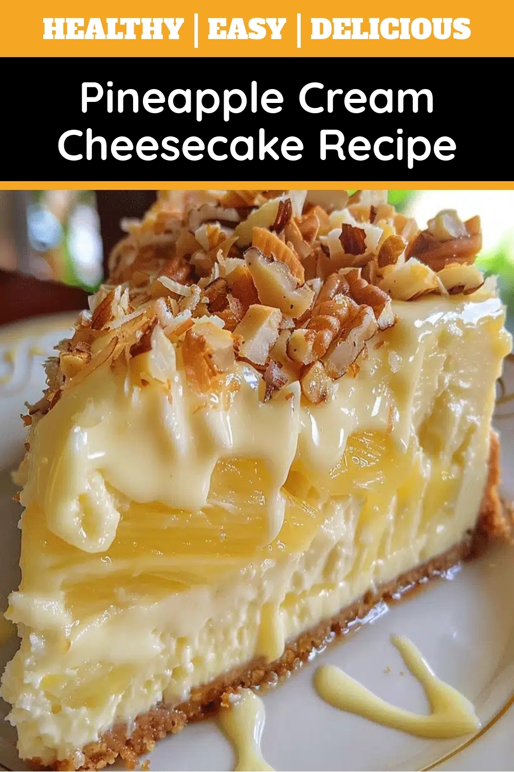 A creamy, no-bake cheesecake with a sweet pineapple swirl and a buttery graham cracker crust.