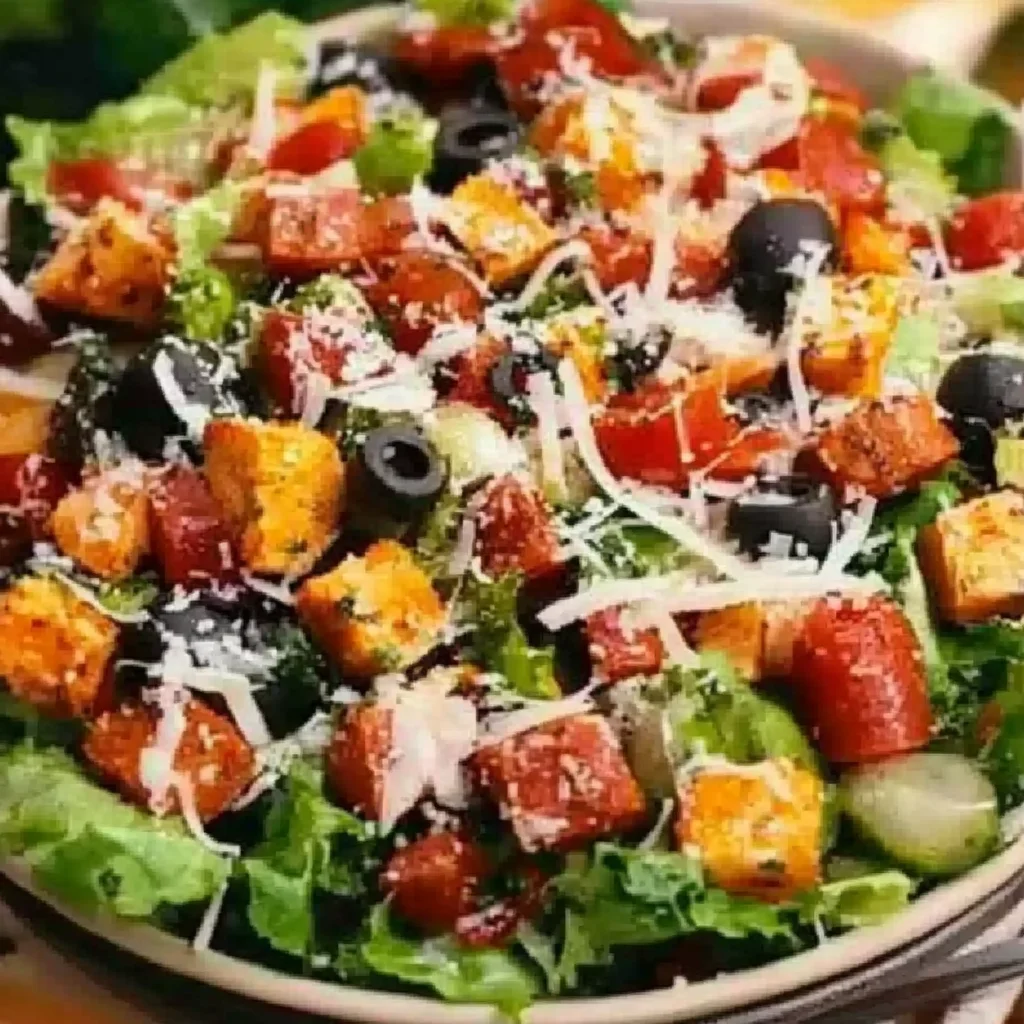 Season the entire salad with a pinch of salt and a few cracks of black pepper. Just before serving, drizzle your chosen Italian dressing or balsamic vinaigrette over everything. (Pro tip: Add the dressing last-minute to keep the greens crisp and the croutons from getting soggy.)