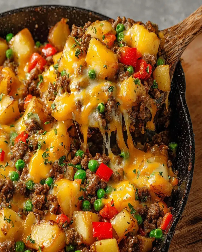 A hearty and comforting one-pan dish featuring crispy potatoes, savory vegetables, and melted cheese.