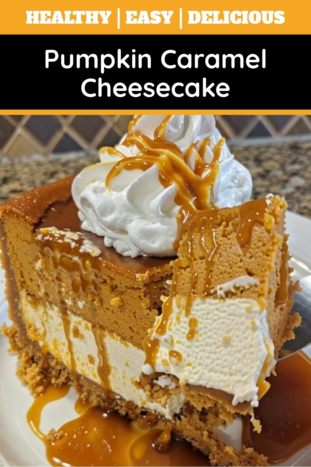 A rich and creamy pumpkin cheesecake swirled with caramel and baked on a spiced graham cracker crust.